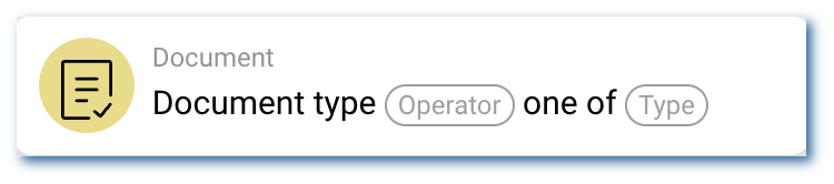 * Users configure the card by selecting the document type field and defining the operator (is or is not). They then specify the list of document types to check against. The setup is straightforward, involving dropdown menus for field and operator selection and a field for entering the list of document types.