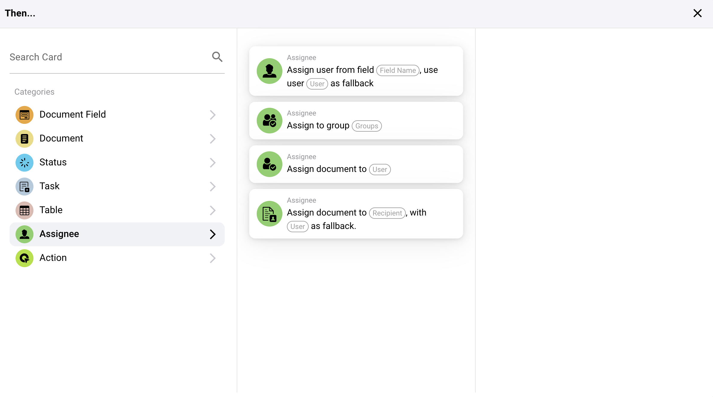 * **Assign User from Field:** Assigns a user to a task or document based on user data stored in a specific field, with an option for a fallback user if the primary is unavailable.