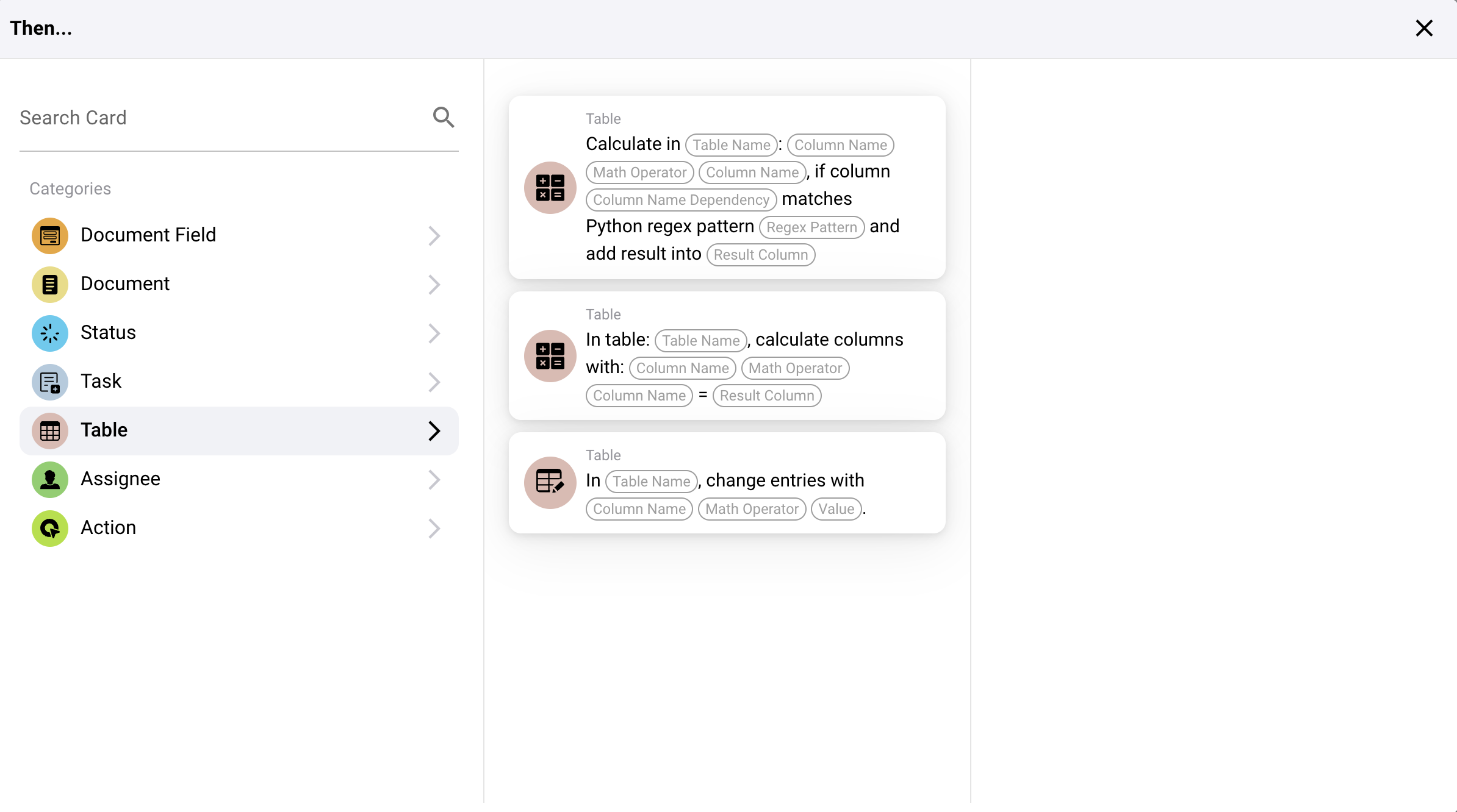 * **Calculate in Table:** Performs calculations on table data based on specified conditions and stores the results in a designated column.