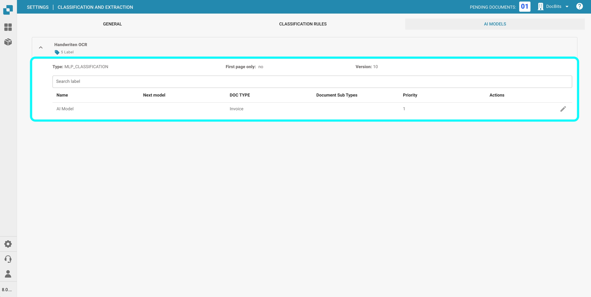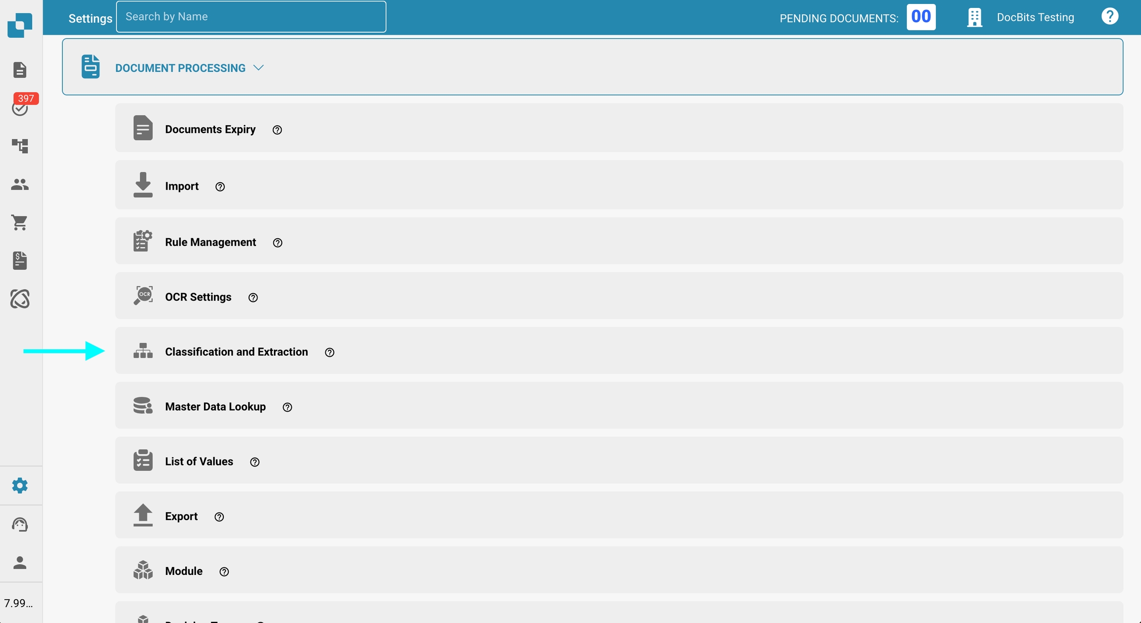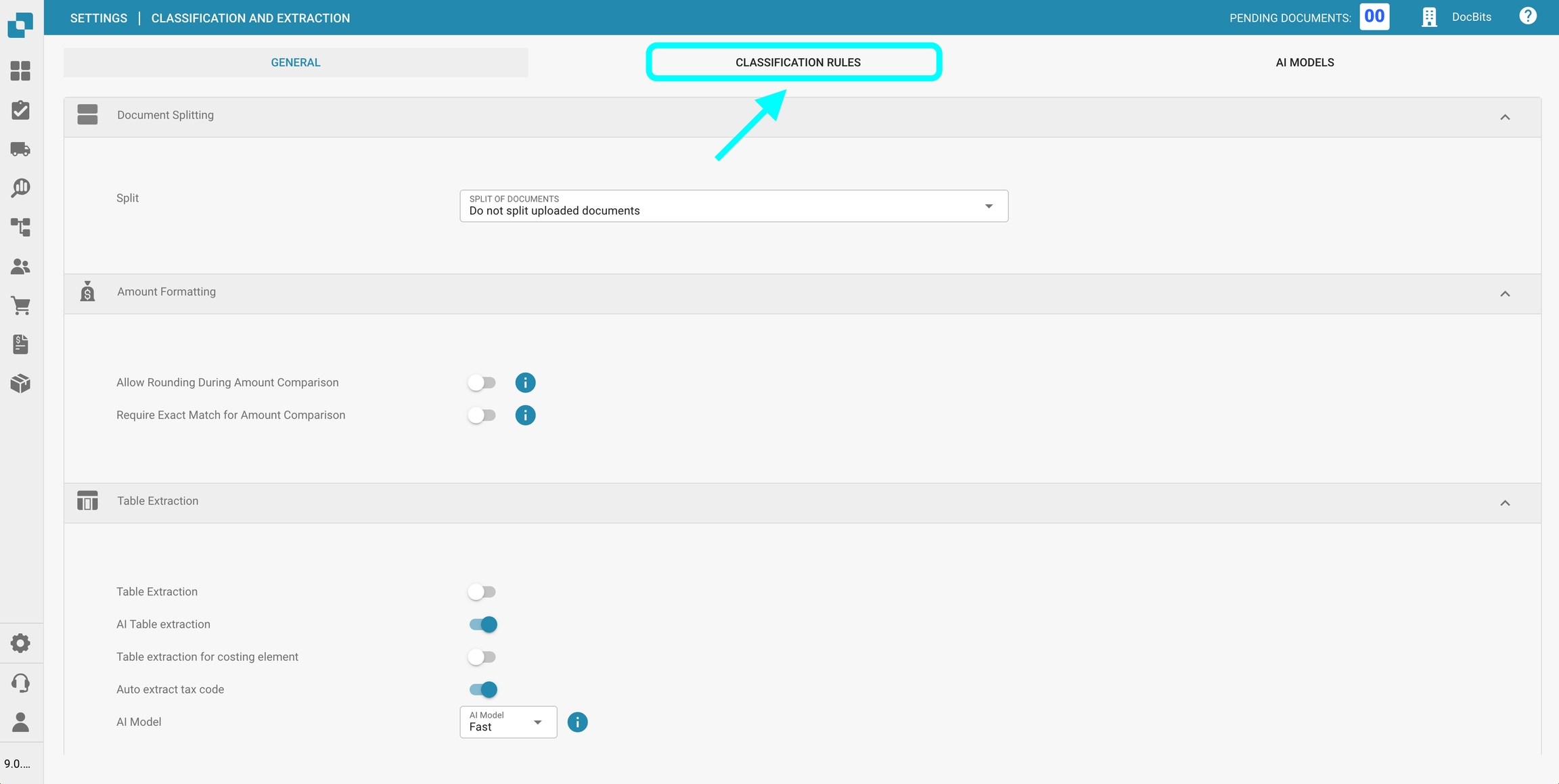 Ga naar de Instellingen voor Classificatie en extractie via: Instellingen → Documentverwerking → Classificatie en extractie