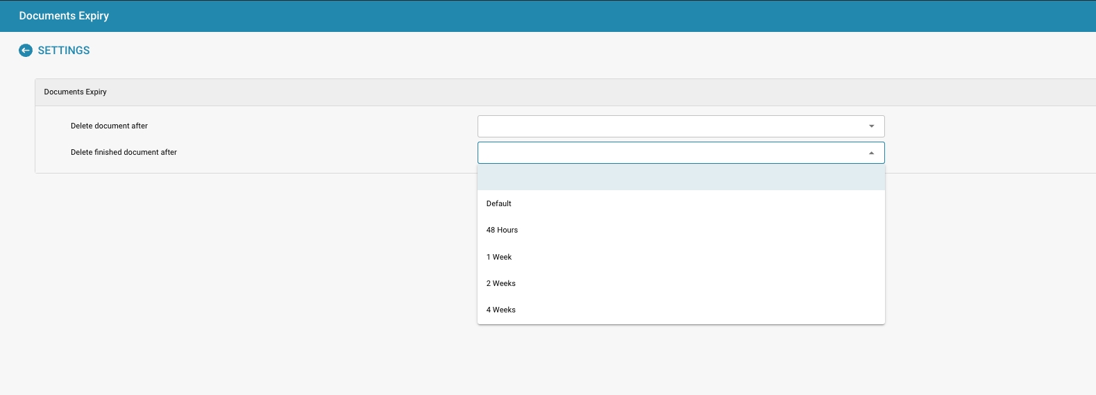 Delete document after: This dropdown allows you to set the time frame after which a document that has been processed will be automatically deleted from the system. You can choose from predefined options like 48 Hours, 1 Week, 2 Weeks, or 4 Weeks. This helps in managing space and maintaining document lifecycle policies.