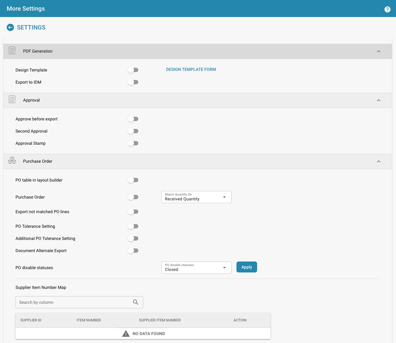Here you can make further settings for the document type, such as design template, whether a document must be approved before export and many other details.
