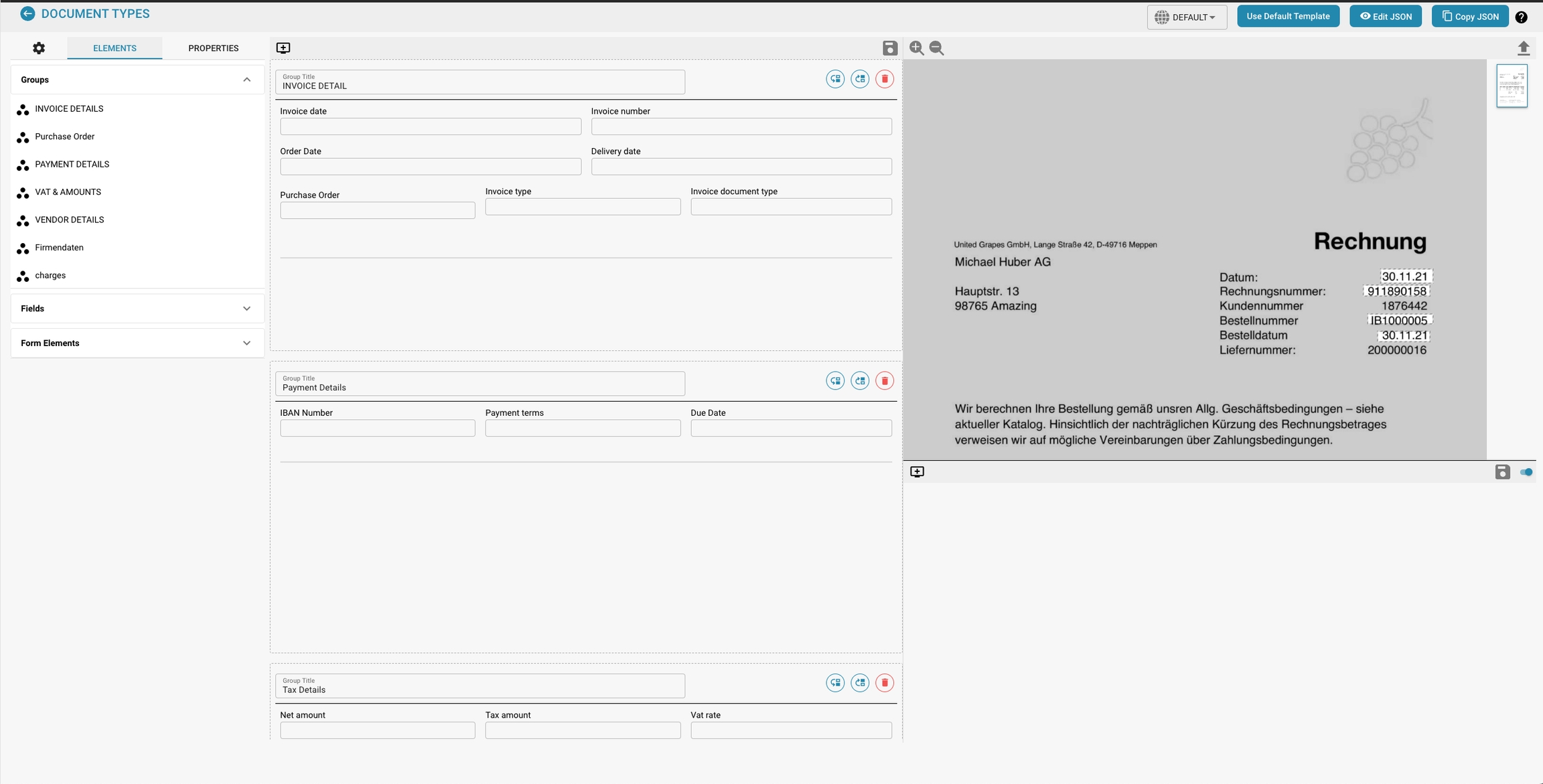 Groups: Organizational units within a document type that categorize related fields (e.g., Invoice Details, Payment Details). These can be expanded or collapsed and arranged to mirror the logical grouping in the actual document.