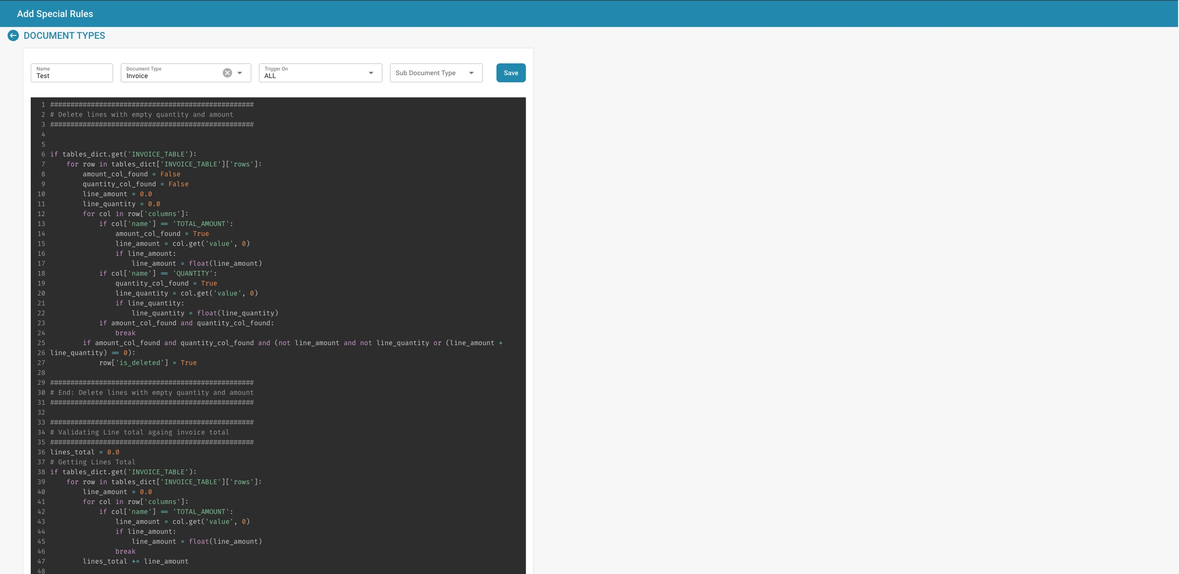 Voorbeeldscript: Scripts kunnen bewerkingen bevatten zoals het doorlopen van factuurregels om totalen te valideren of om invoer te verwijderen die niet aan bepaalde criteria voldoet.