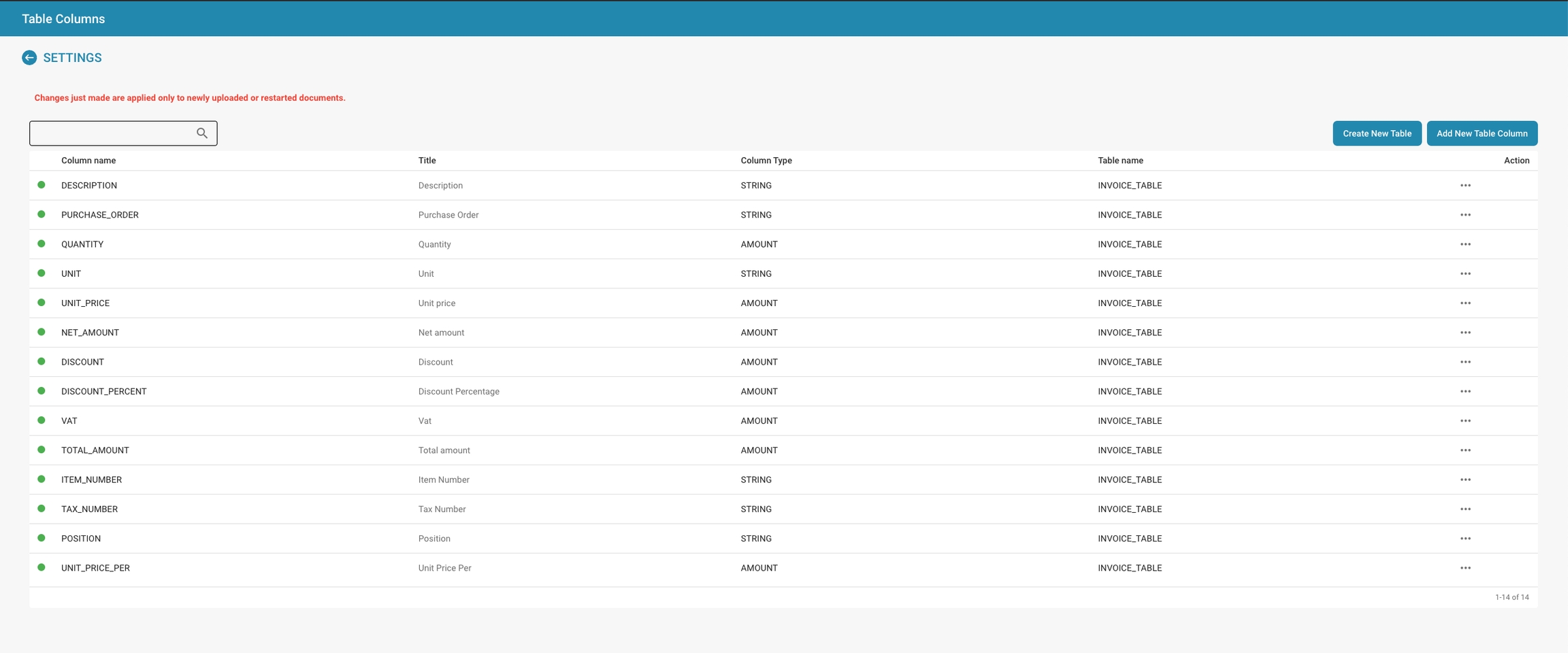 De Tabelkolommen-interface in Docbits wordt gebruikt om de kolommen te specificeren die verschijnen in datatabellen voor elk documenttype. Elke kolom kan worden geconfigureerd om specifieke soorten gegevens vast te houden, zoals strings of numerieke waarden, en kan essentieel zijn voor sorteer-, filter- en rapportagefuncties binnen Docbits.