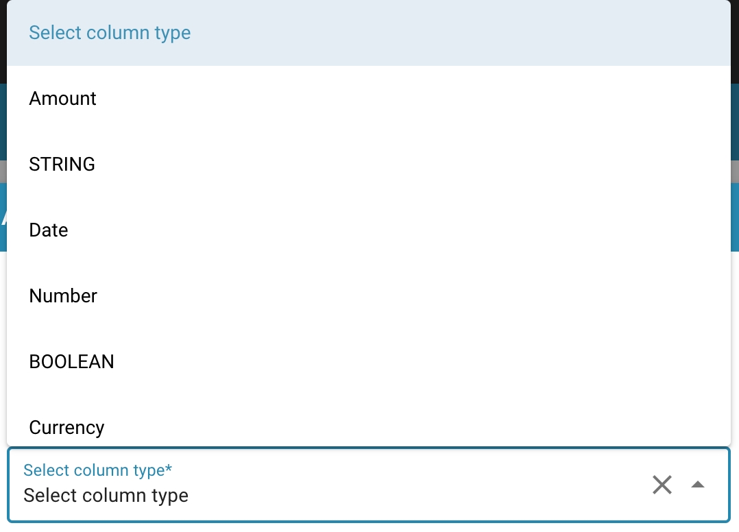 Choose the most appropriate column type based on the data that will be stored in the column. This can be AMOUNT for amount, STRING for strings, DATE for dates, etc.