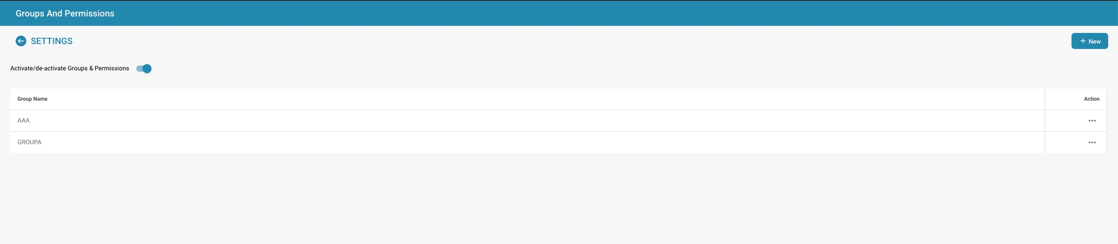 Groepenlijst: Toont de lijst van beschikbare gebruikersgroepen binnen de organisatie. Elke groep kan worden geconfigureerd met specifieke machtigingen. Beheerders kunnen nieuwe groepen toevoegen door op de knop "+ Nieuw" te klikken.
