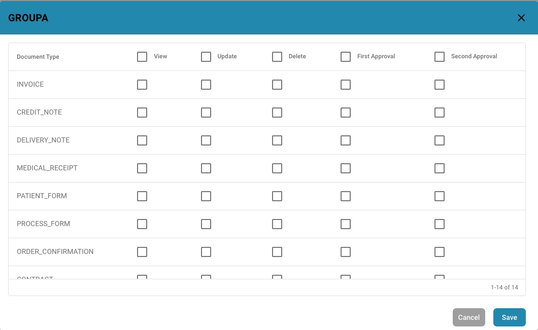 Voor elk documenttype zijn er selectievakjes voor verschillende machtigingen: