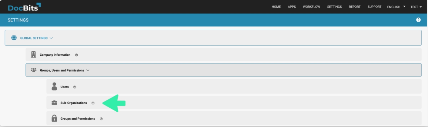 Ga naar Instellingen, Globale Instellingen → Groepen, Gebruikers en Rechten → Suborganisaties zoals hieronder weergegeven.