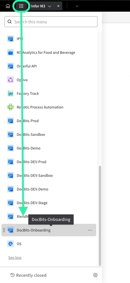 Go back to the left menu in Infor and select the application you just created.