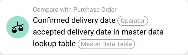 Master Data Table Lookup: The card references a master data lookup table specified by the user (identified by the <Master Data Table> parameter). This table contains the accepted delivery dates for comparison.