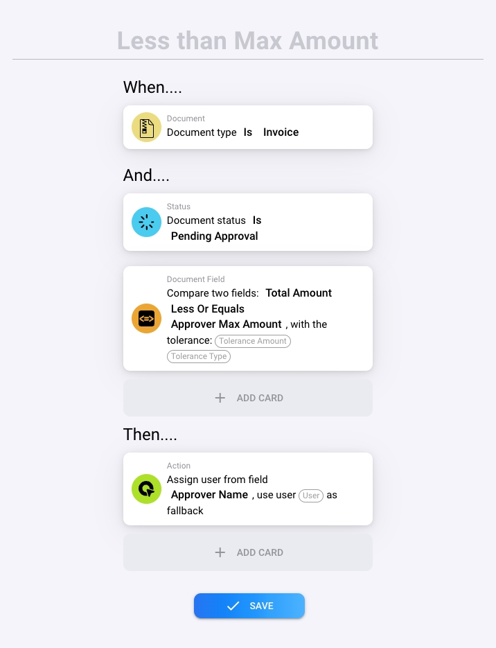 Compare two fields: Total Amount Less Or Equals Approver Max Amount: This condition compares the total amount of the invoice to an approver's maximum authorized amount. If the invoice's total amount is less than or equal to this max amount, the rule continues to the next step. This likely includes a tolerance level that allows for minor deviations within specified limits.