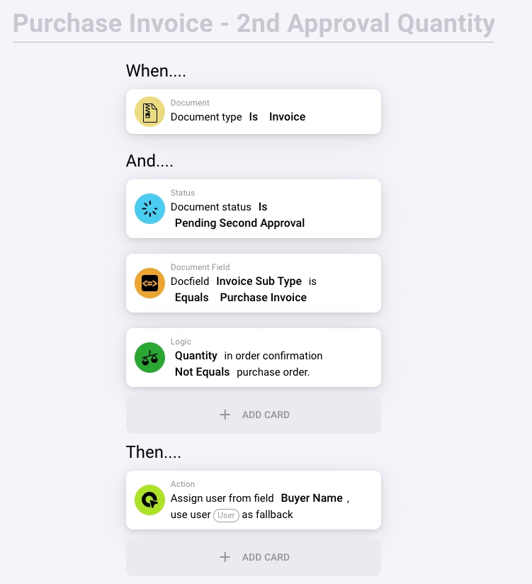 Document Type is Invoice: This condition ensures that the rule is activated only for documents classified as invoices. This is essential for maintaining specificity and relevance in the workflow.