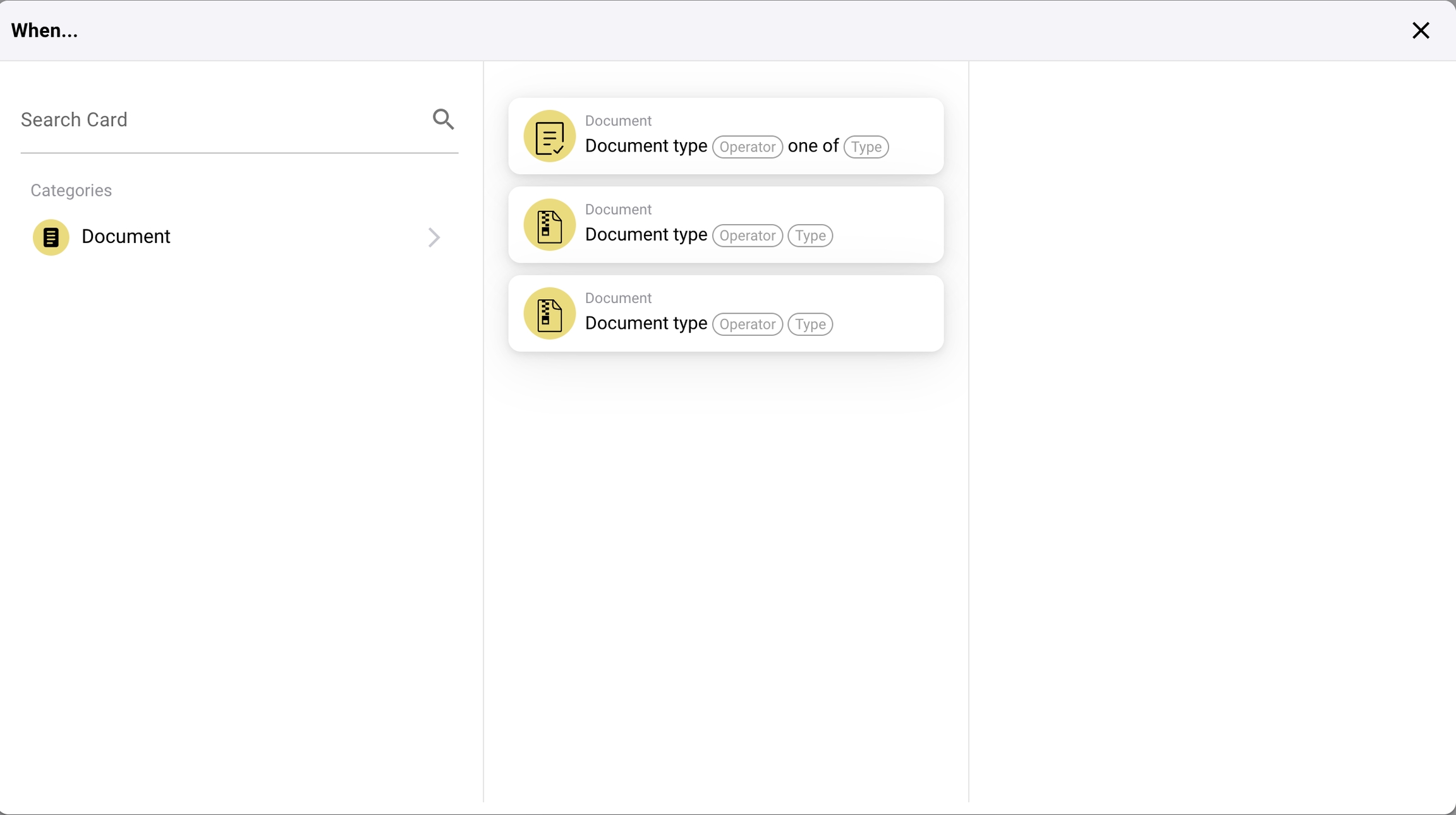 Document type (Operator) one of (Type): This card triggers an action when the type of a document matches one of the specified types in a list. The operator might include options like "is" or "is not," allowing for inclusive or exclusive conditions.