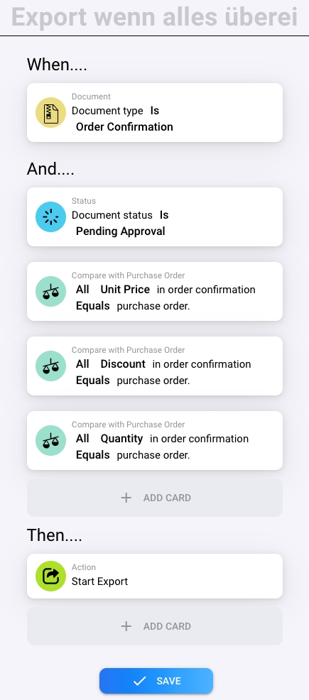 Additional checks are performed to ensure the document's details align with specific requirements. These checks might involve verifying information within order confirmations or purchase orders. Specify the particular conditions that need to be met. For example: