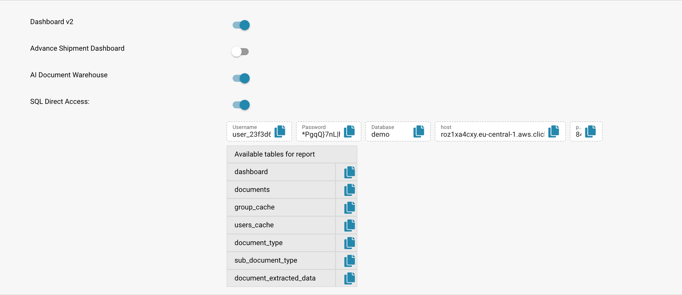 Navigate to the SQL Direct Access section in the settings module. Here, you will find credentials and access details, including username, password, database name, and host information.