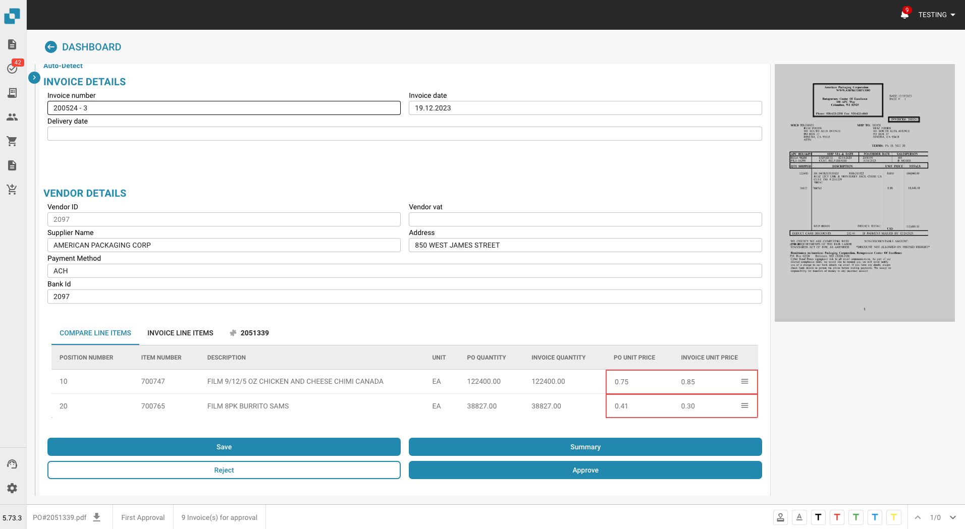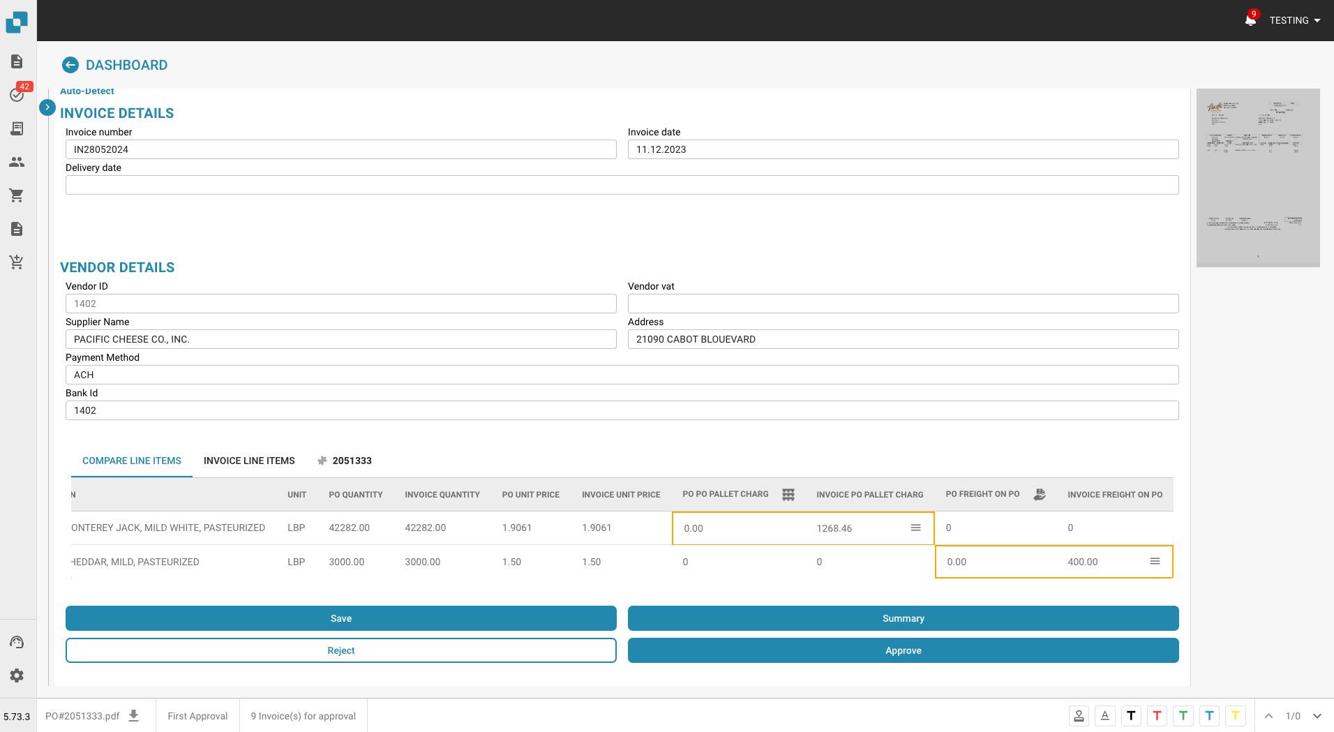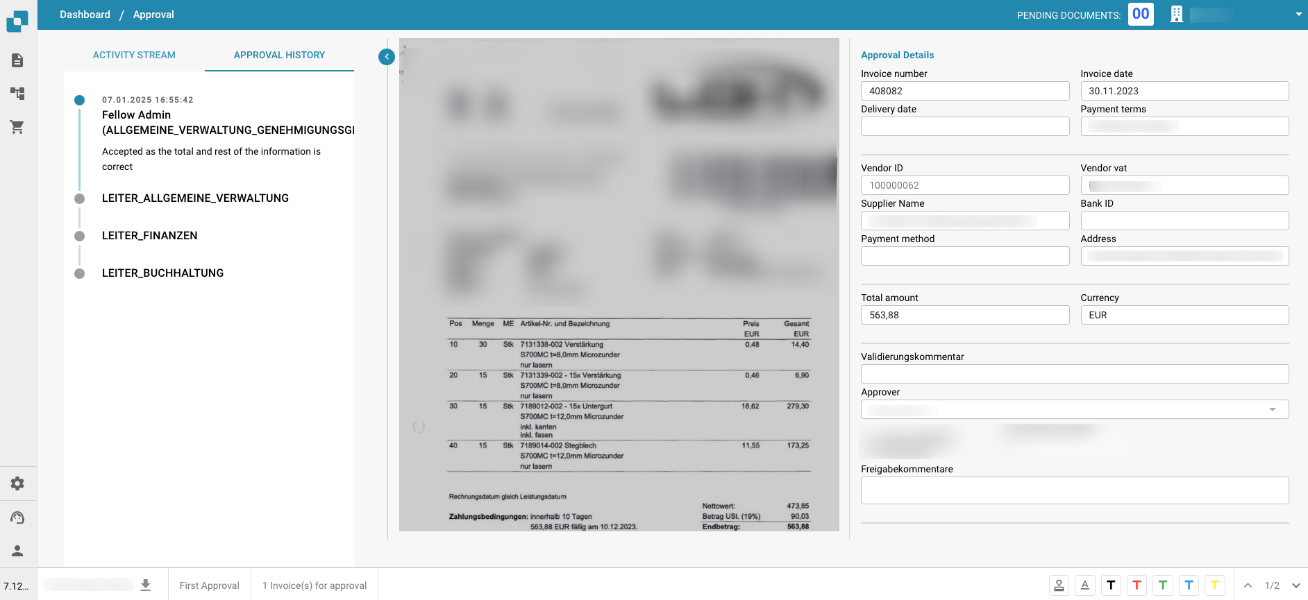 Auto Accounting Informatie op het Goedkeuringsscherm: Het goedkeuringsscherm presenteert nu automatische boekhouddetails naast factuurinformatie. Deze verbetering biedt dieper inzicht in transactiegegevens, wat soepelere beoordelingsprocessen en beter geïnformeerde besluitvorming over facturen mogelijk maakt.
