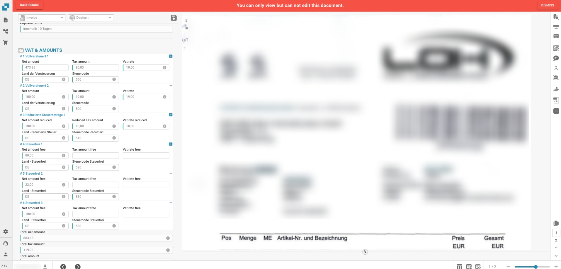 Gebruikerstoegang toegevoegd aan OCR-extractieresultaten: De knop OCR-weergave op het veldvalidatiescherm is nu beschikbaar voor alle gebruikers die validatietoegang hebben, in plaats van beperkt te zijn tot beheerders. Met deze update kan elke geautoriseerde gebruiker OCR-extractieresultaten direct bekijken, waardoor het gemakkelijker wordt om de nauwkeurigheid van gegevens te valideren en de algehele OCR-prestaties te monitoren. Deze verbetering bevordert meer transparantie en verbetert de efficiëntie van de validatieworkflow.