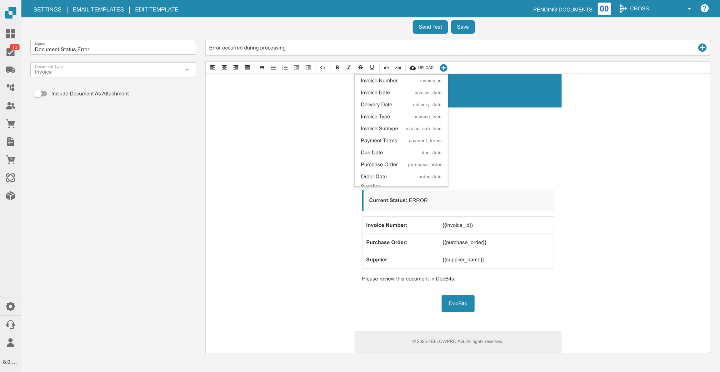 De e-mail template editor is opnieuw ontworpen om een duidelijkere structuur en soepelere ervaring te bieden. Het selecteren van documentvelden is nu intuïtiever en bijlagen kunnen direct binnen templates worden toegevoegd. Deze verbeteringen maken het sneller en gemakkelijker om professionele, op maat gemaakte e-mails te creëren.