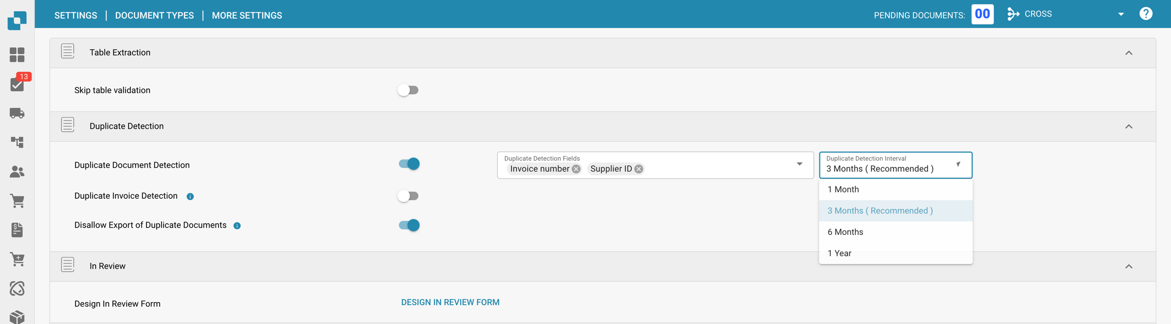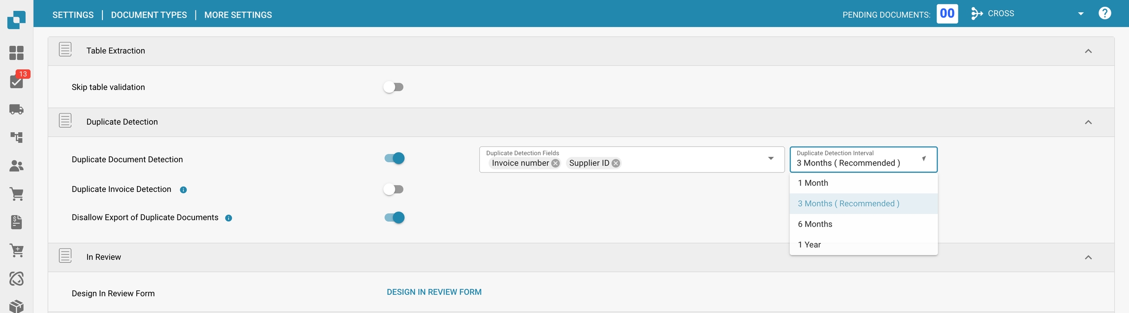 Duplicaat detectie is geüpgraded met twee krachtige configuratieopties. Het Duplicaat Detectie Interval stelt u in staat een tijdsbereik te definiëren om nauwkeuriger op duplicaten te controleren, terwijl de Sta Export van Duplicaten Niet Toe instelling automatisch voorkomt dat documenten die als duplicaat zijn gedetecteerd worden geëxporteerd. Samen bieden deze verbeteringen meer controle en zorgen voor hogere gegevensnauwkeurigheid.