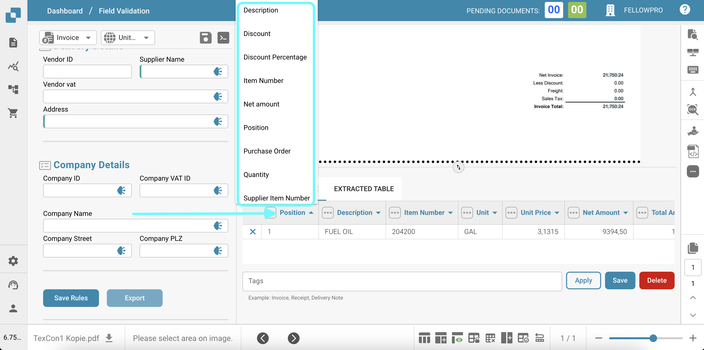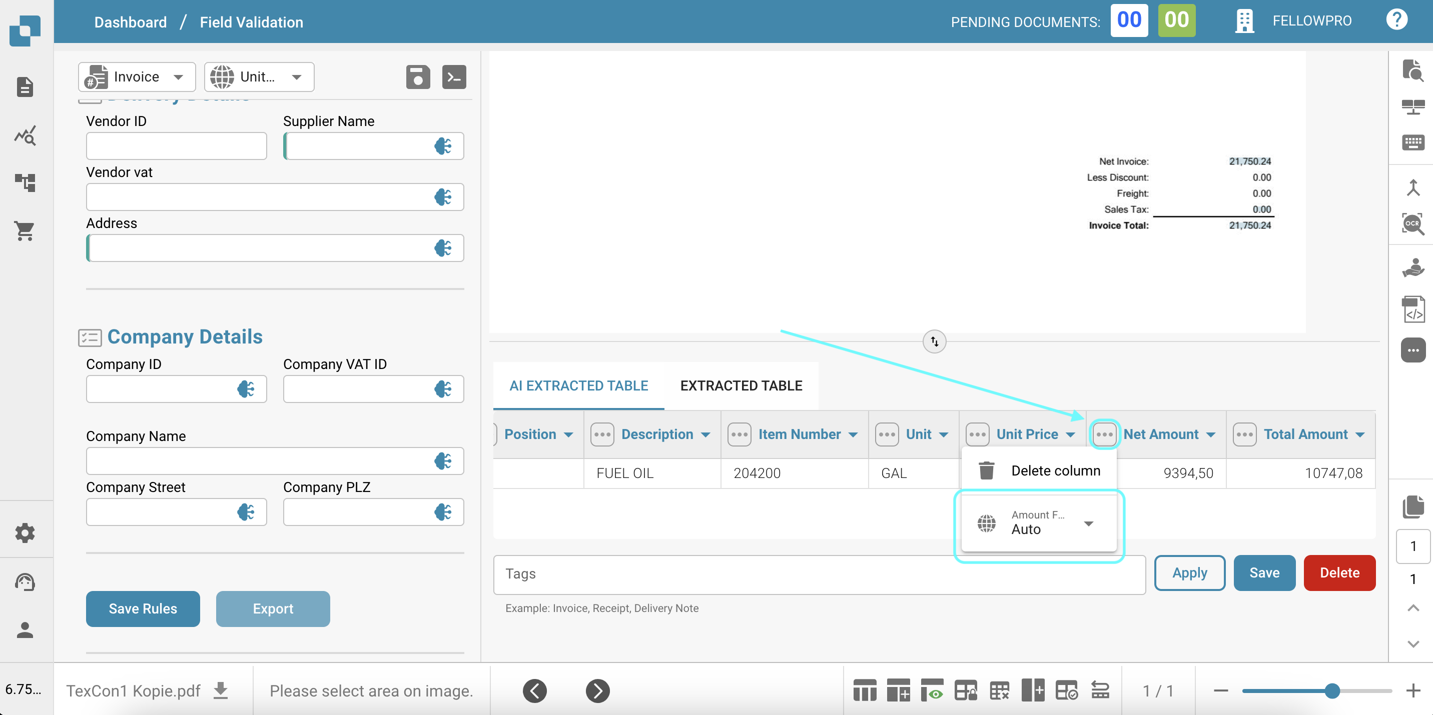 These features provide users with flexibility and control over the extracted data, enabling them to tailor the information according to their specific needs and preferences. The AI Extracted Table aims to enhance the user experience by offering a seamless and intuitive way to interact with and analyze invoice data.