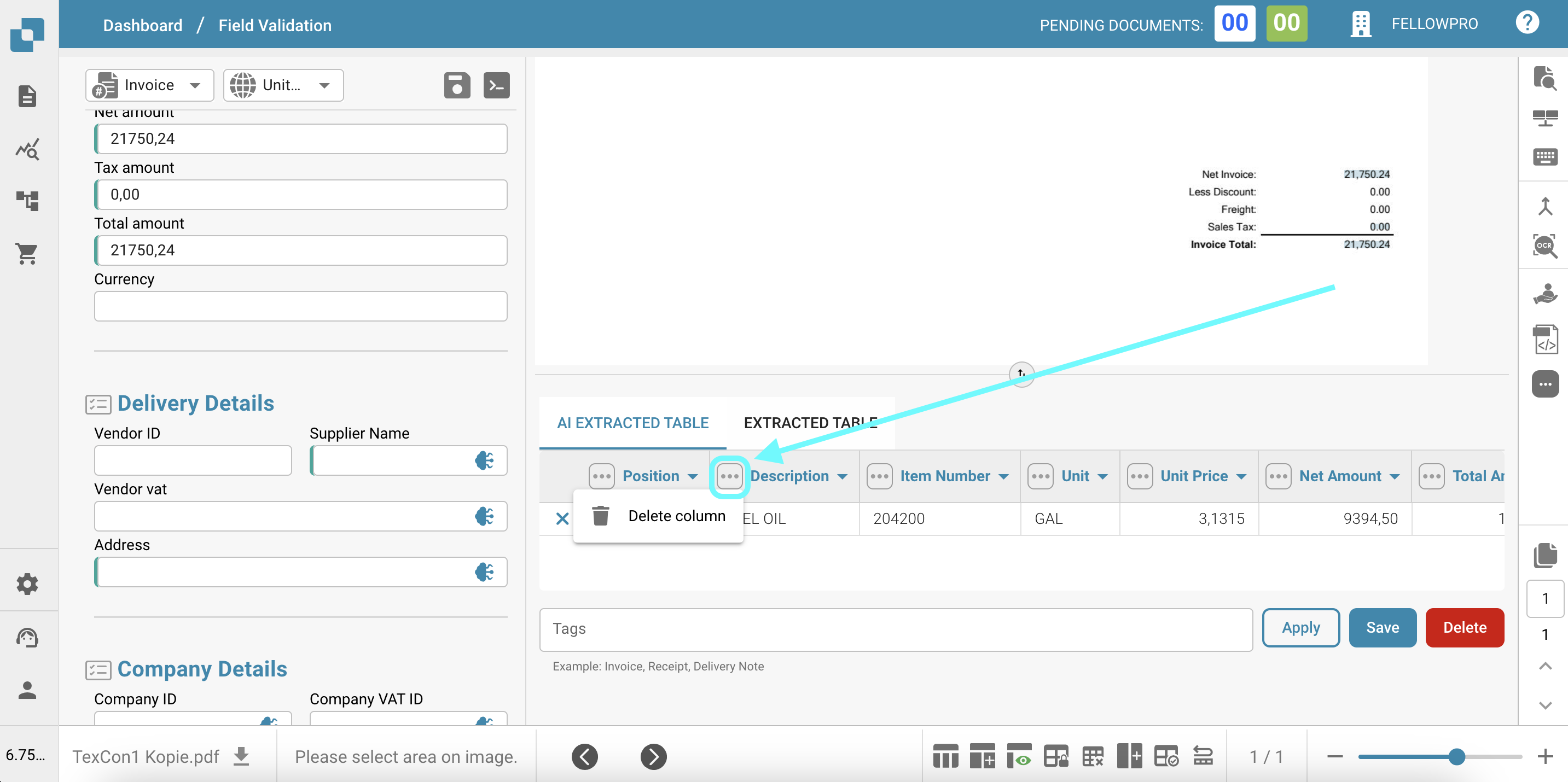The AI Extracted Table feature allows users to easily manipulate and customize the extracted data from the invoice document. Here are the key capabilities and usage instructions:
