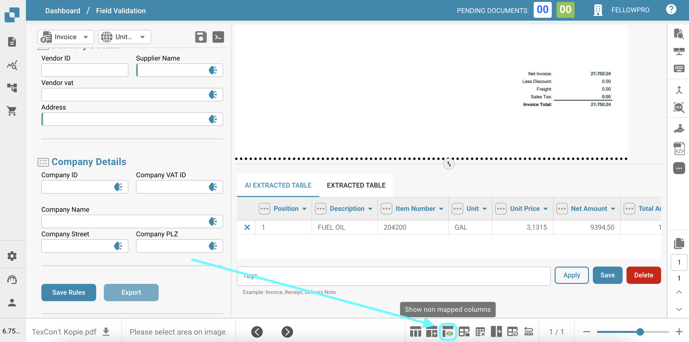 * **Showing/Hiding Non-Mapped Columns**: By default, only the mapped columns (columns with extracted data) are visible in the table. However, users can choose to show or hide the non-mapped columns by clicking the "Hide non mapped columns" or "Show non mapped columns" button at the bottom of the table. This feature is useful when users want to review all available columns, even if they don't currently contain data.