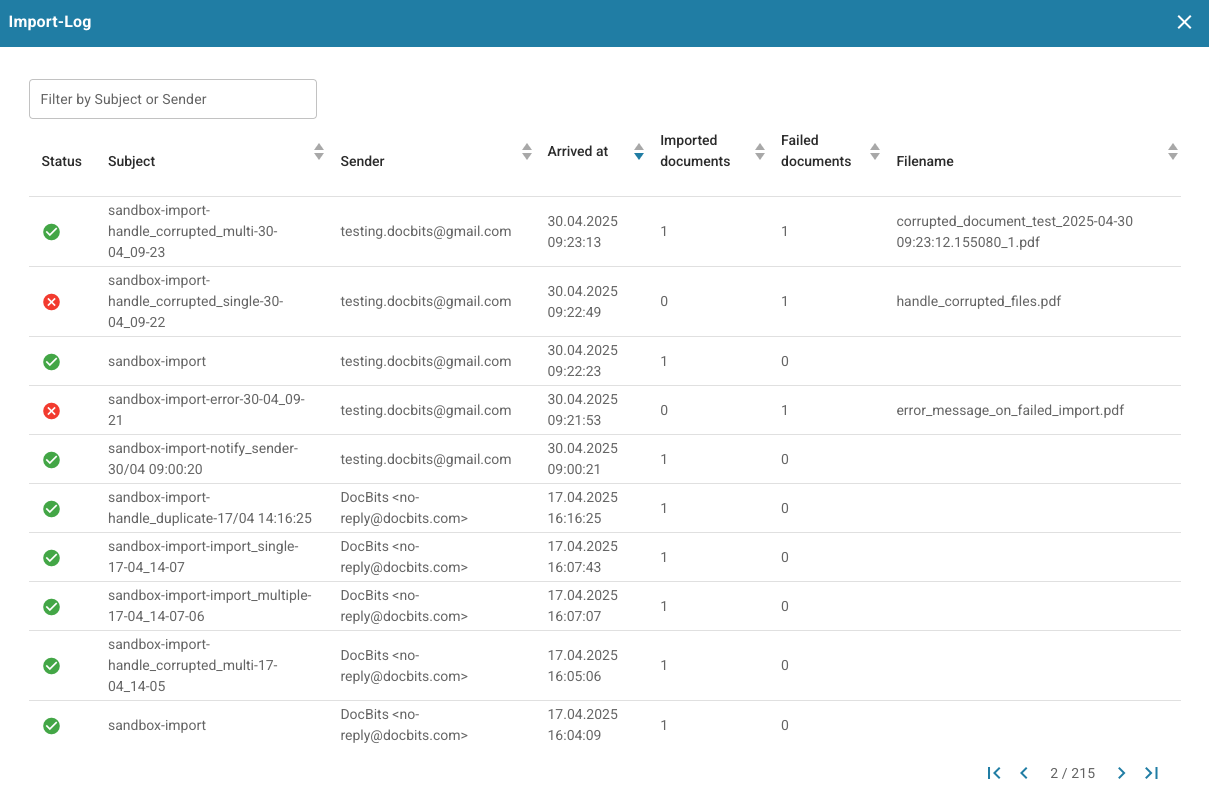 Use this button to open a table displaying all recently imported documents via email, along with relevant information for each.