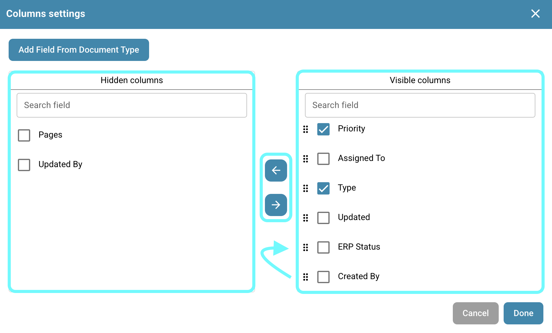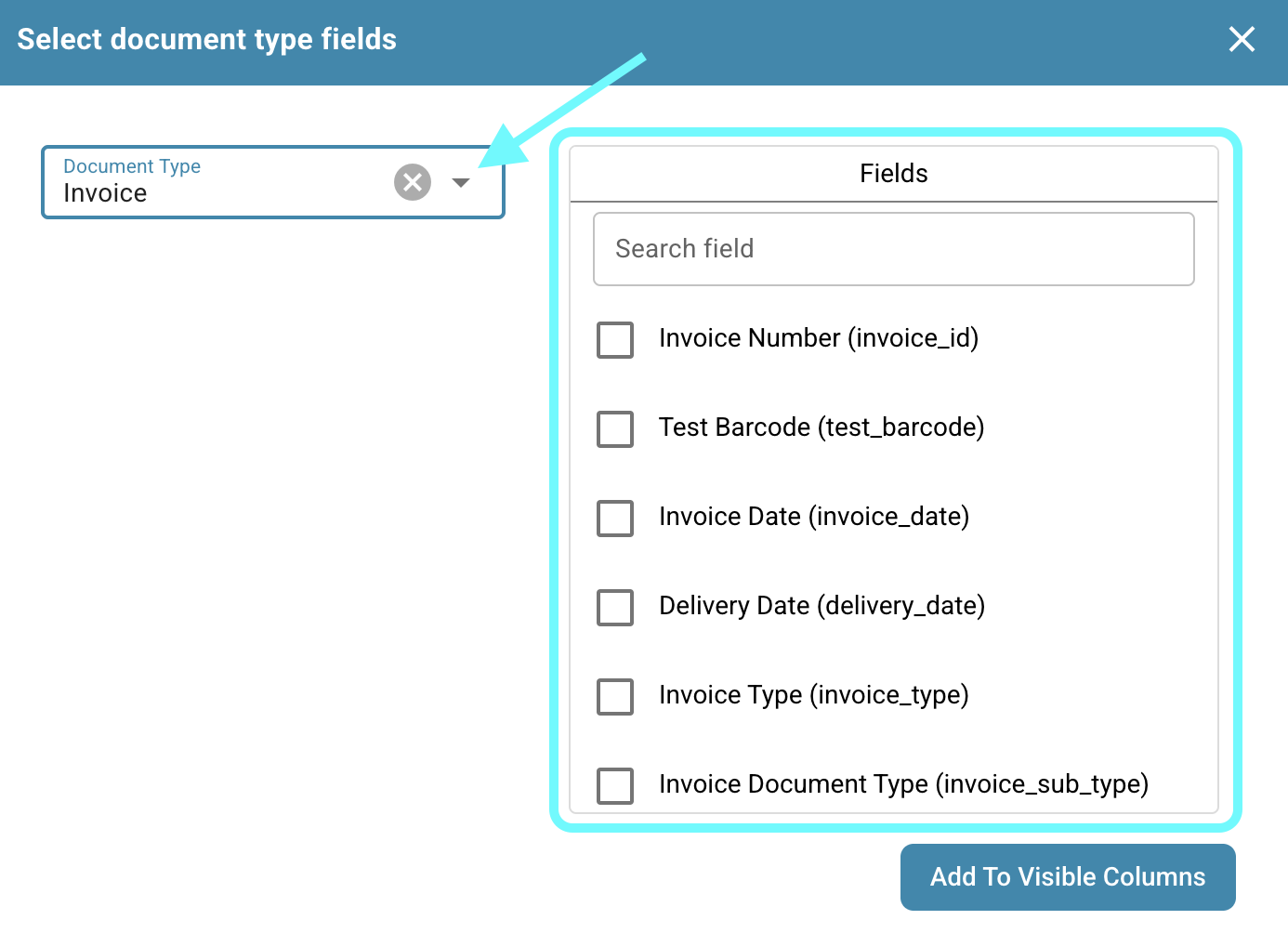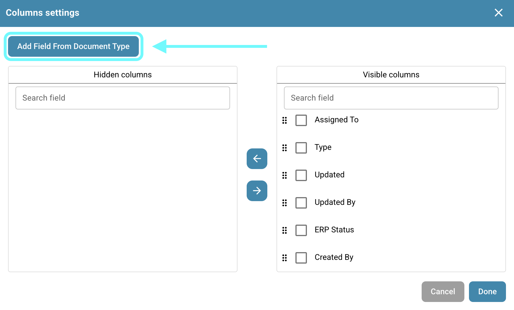 You also have the option to add additional columns from specific fields of specific document types to customize your dashboard view. To do this, simply click **Add Field from Document Type**.
