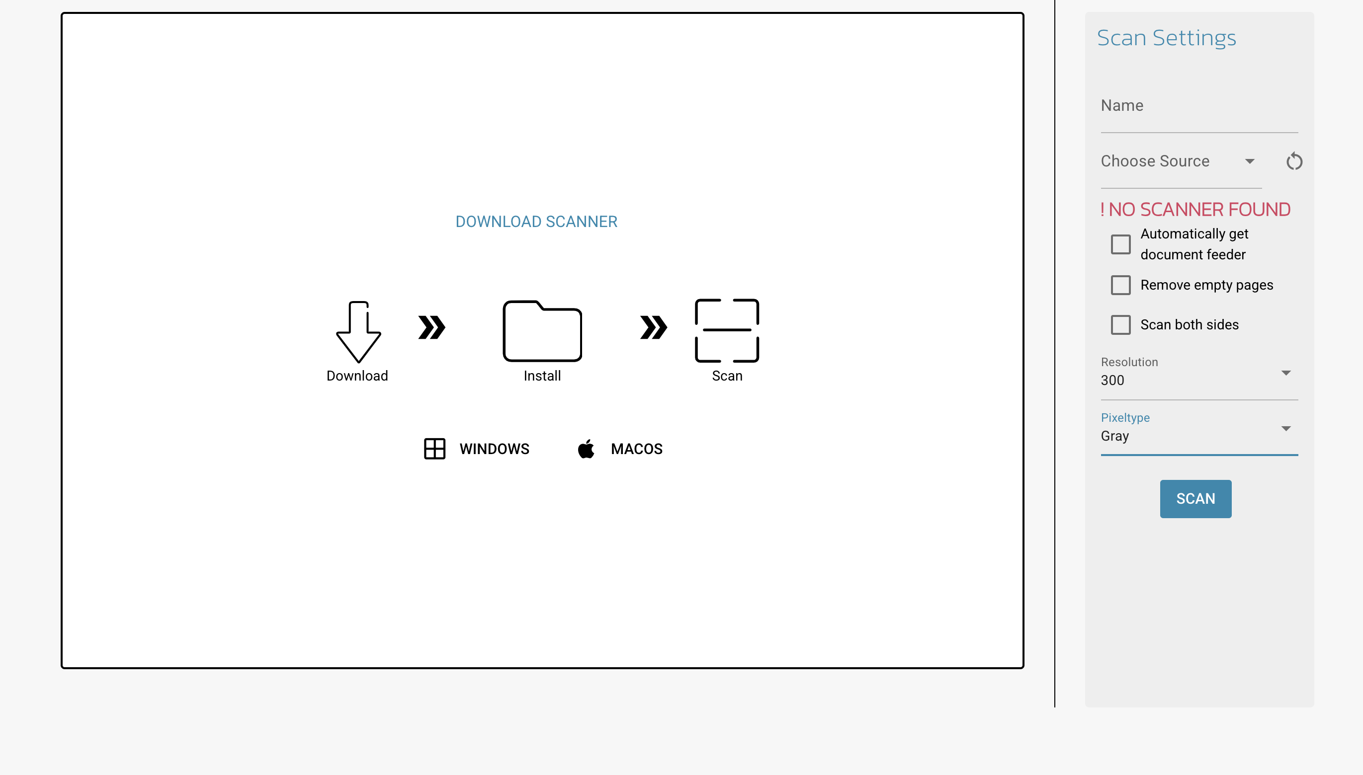To use this feature, you need to have a scanner connected to your system. If a scanner is available, you can select it on the right, name your document, and click **Scan**. Optionally, you can adjust scanning settings on the right before starting the process.