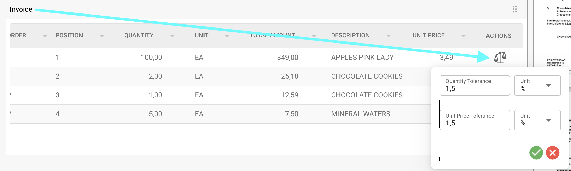 If tolerances are configured in the system settings, you can adjust them for the allowed attributes directly in the **Extracted Table** under the **Actions** column.
