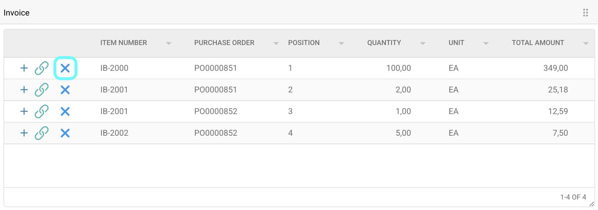 To remove a connection between a purchase order line item and an extracted line item, simply click the **X** icon next to the matched pair.\nOnce removed, the connection is canceled, and the line item becomes available for matching again.