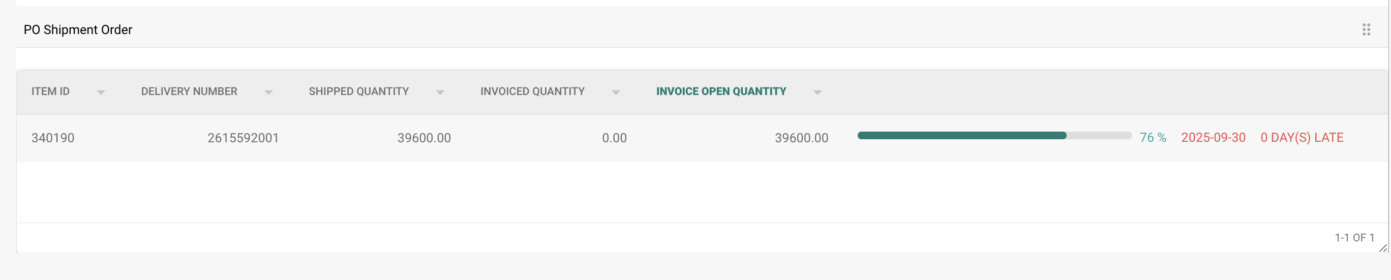 This section provides a visual overview of how much has been delivered and invoiced for each PO item.\nIt helps track invoicing progress using quantity values and a progress bar.