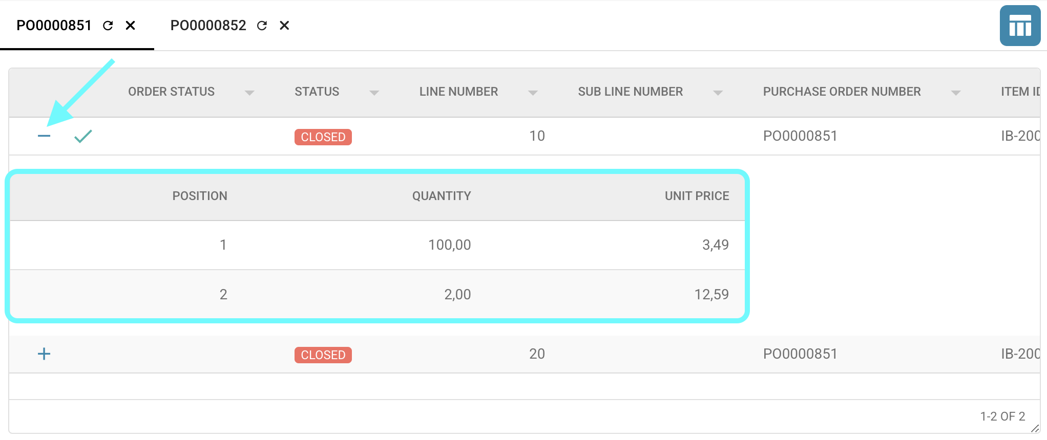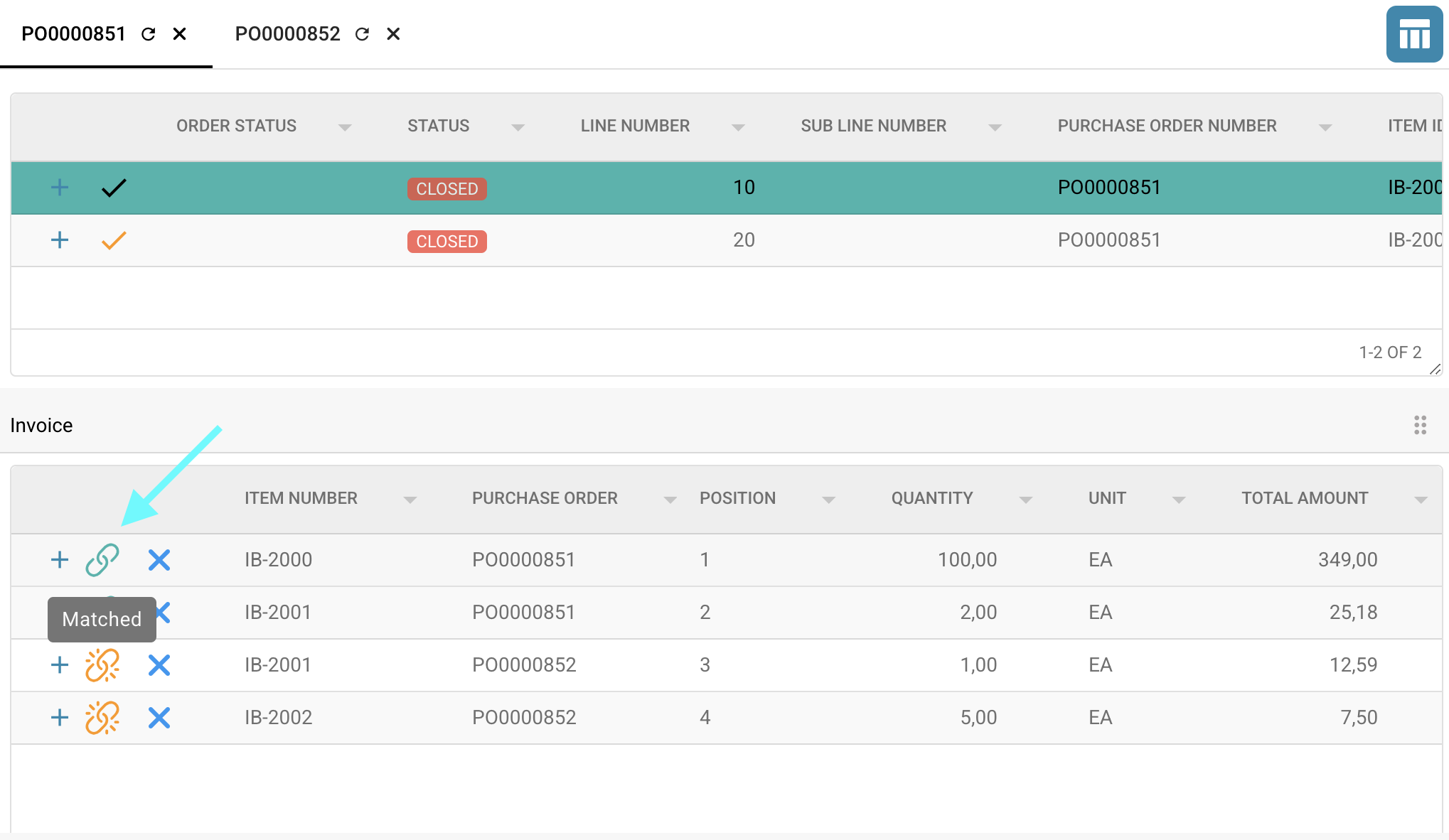 If a single line item is matched to multiple lines, you can view detailed information by clicking the plus (+) icon next to the respective line item.