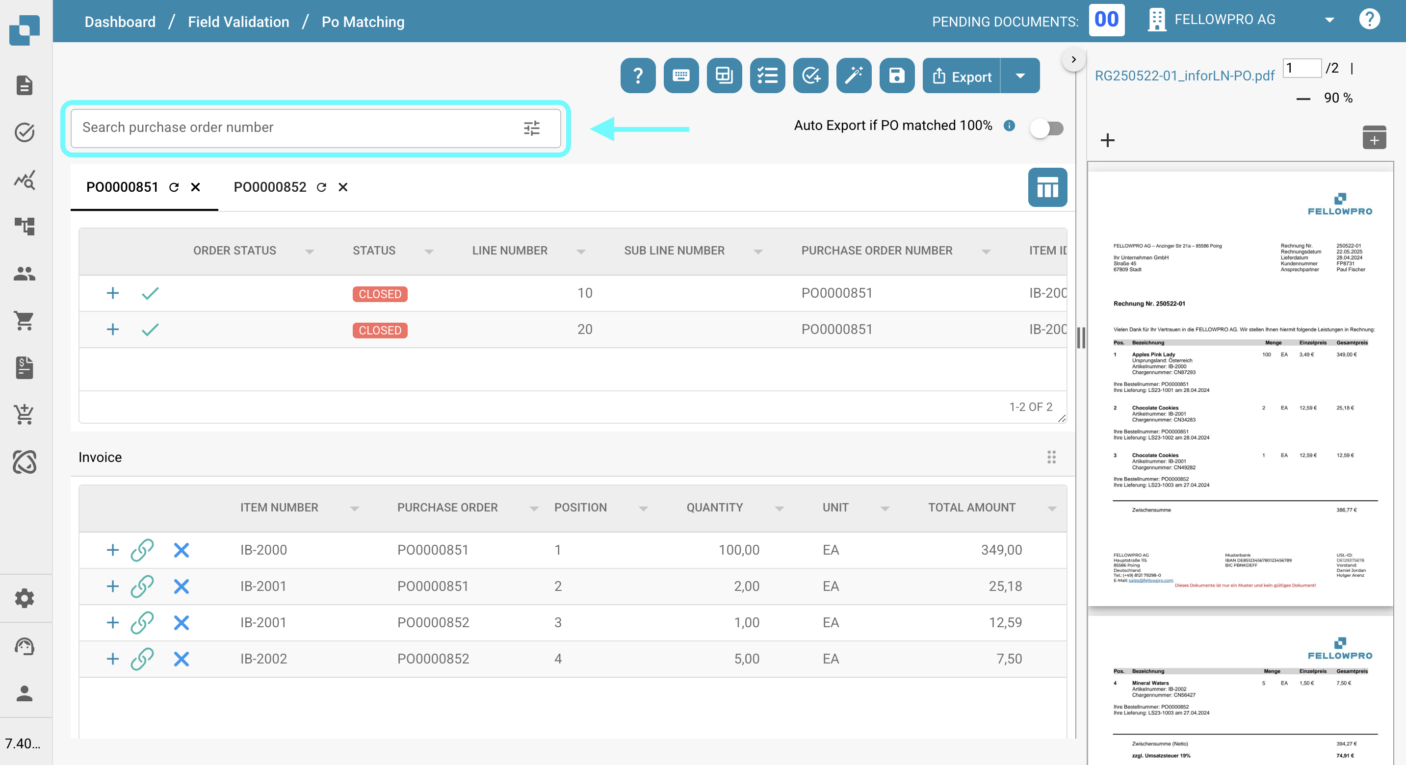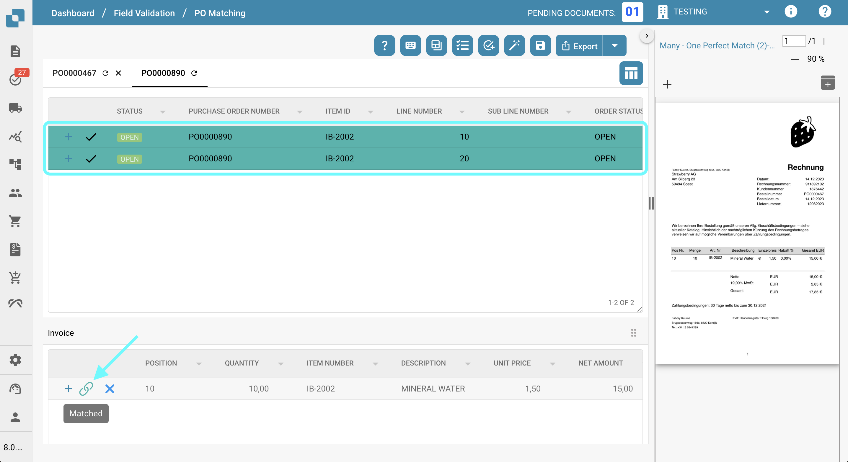 On the right side of the **Purchase Order Matching** screen, you can view the document to assist with validation.