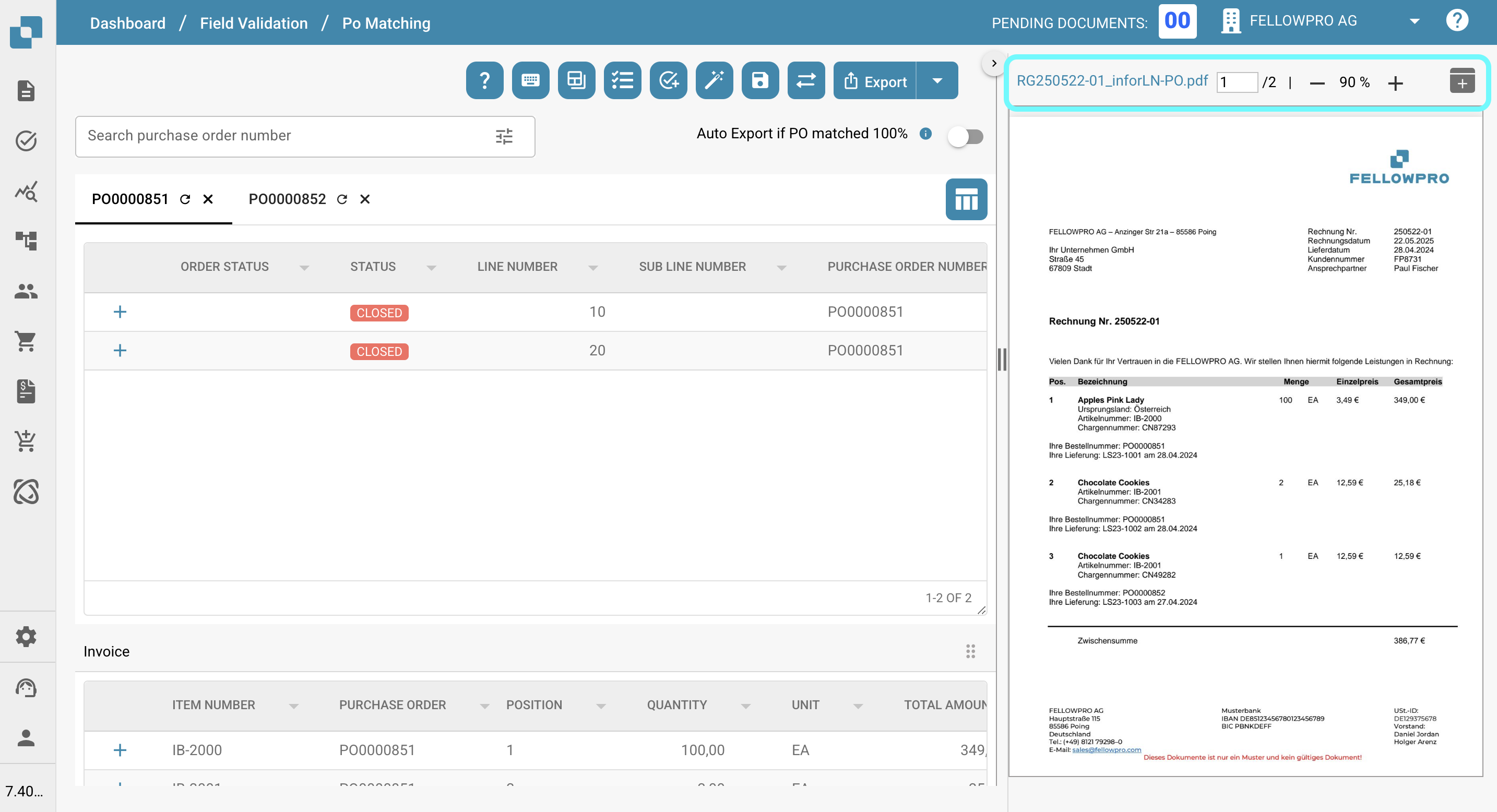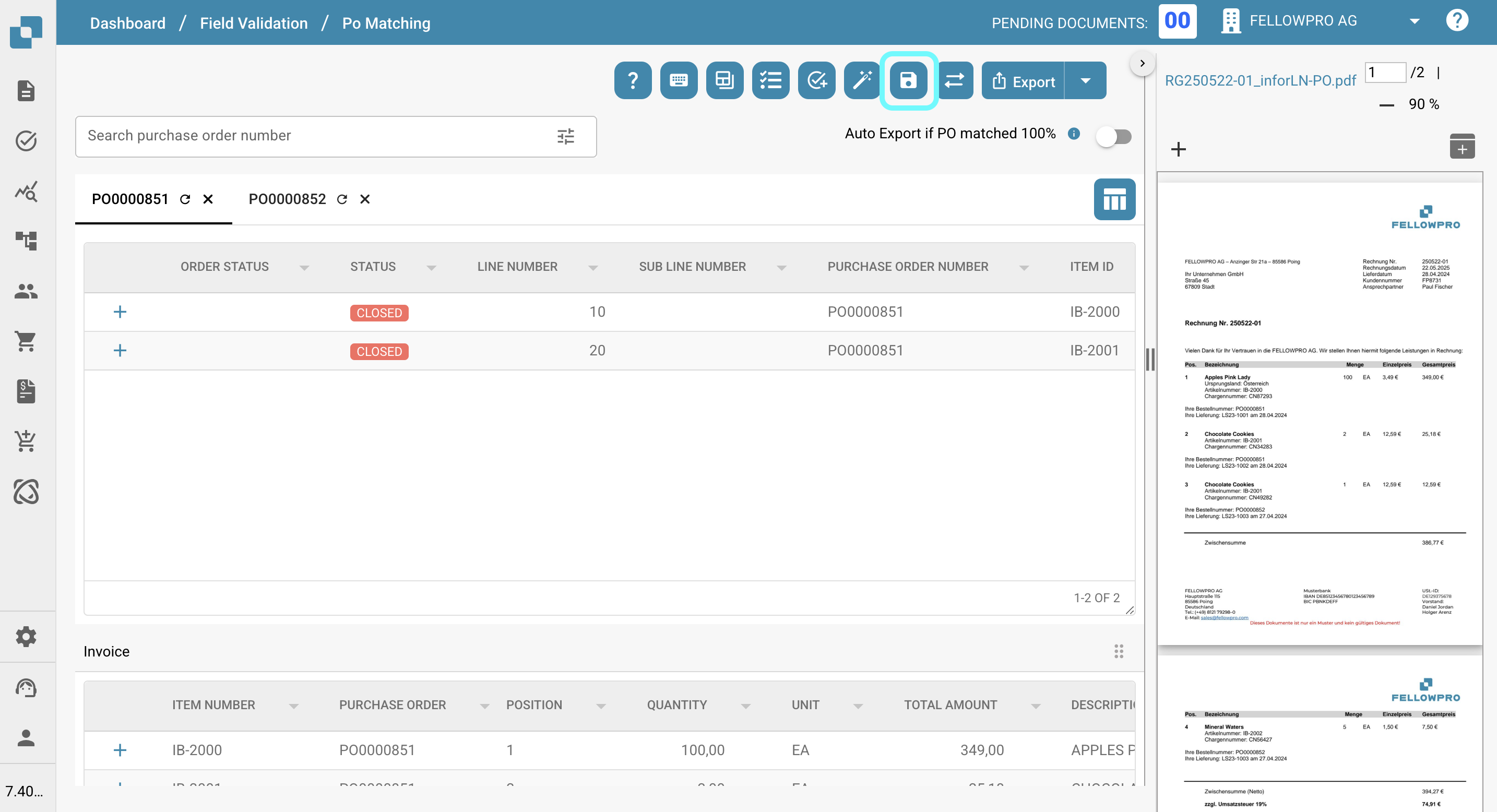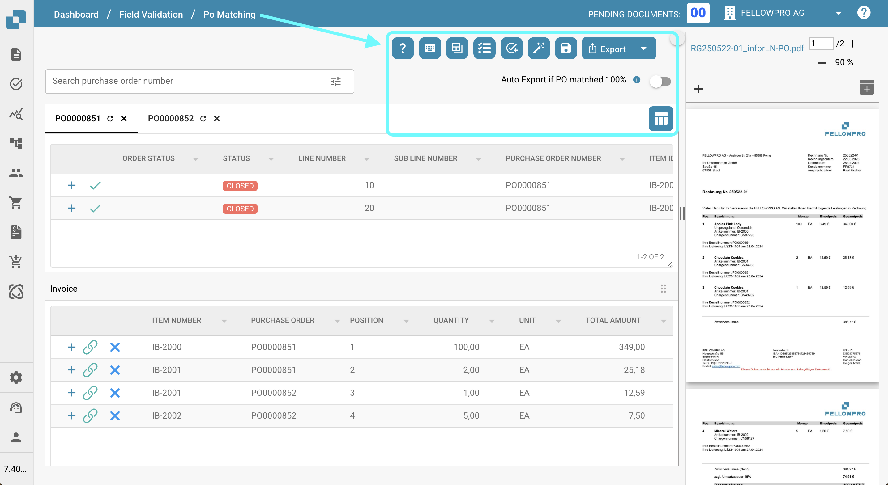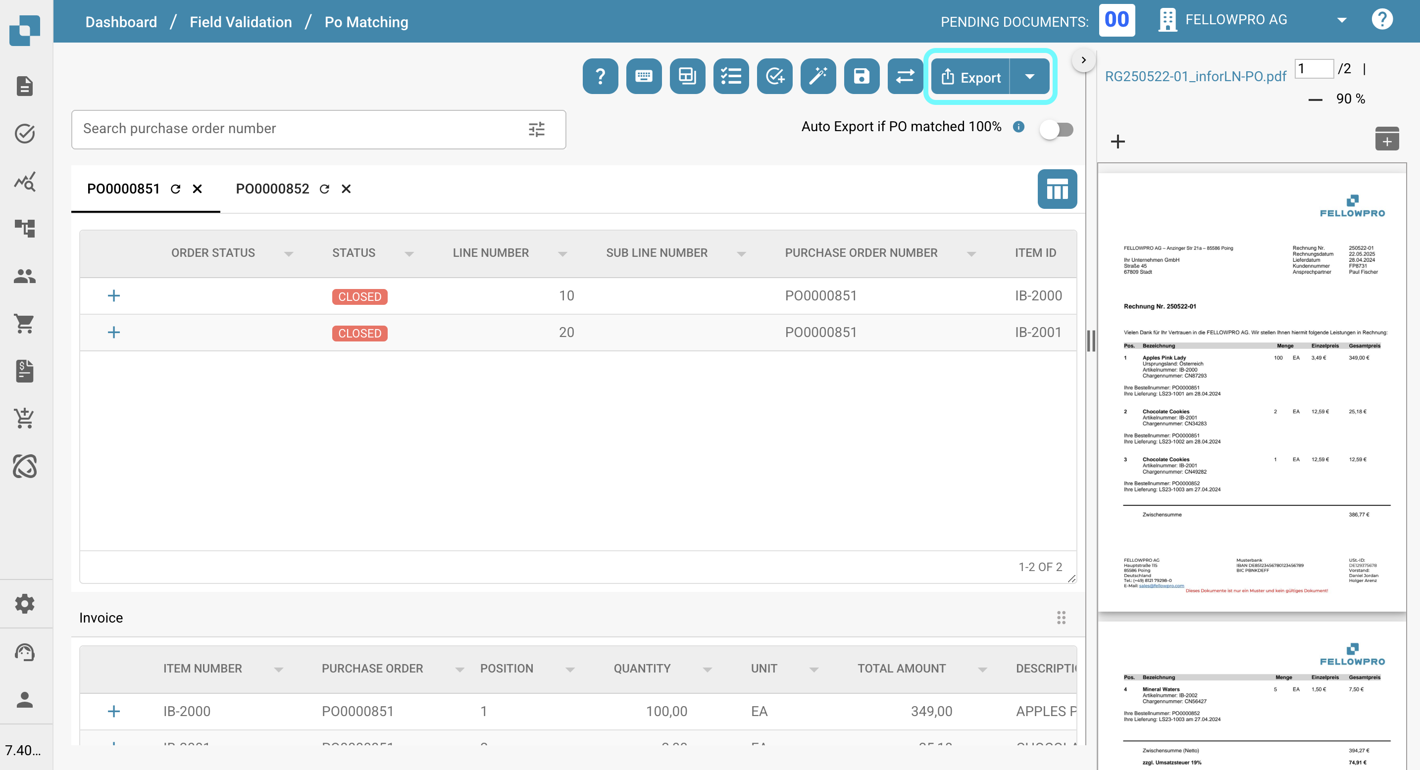 After matching all line items and validating their correctness, you can export the document by clicking the **Export** button in the toolbar.