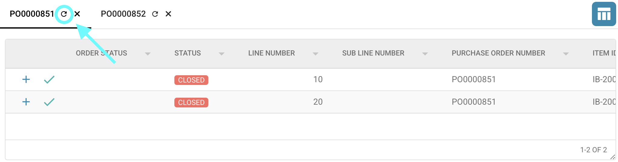 To resynchronize the data in **DocBits** with the data from **Infor**, click the **refresh button** next to the purchase order number above the table.