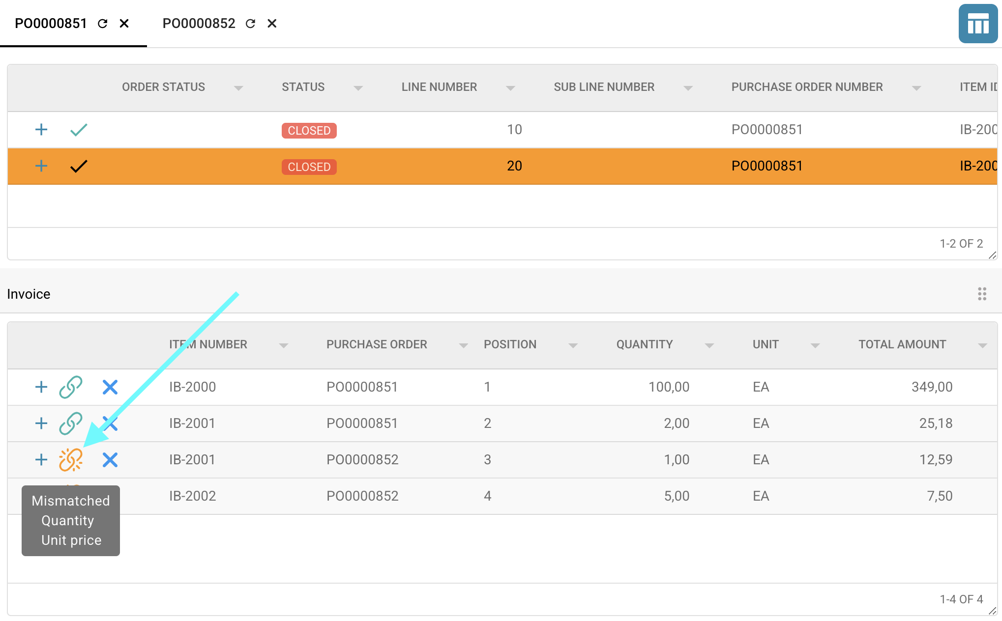 * This icon indicates that the line item contains a mismatch. You can hover over the icon to highlight the corresponding purchase order line and view the columns where mismatches occur.