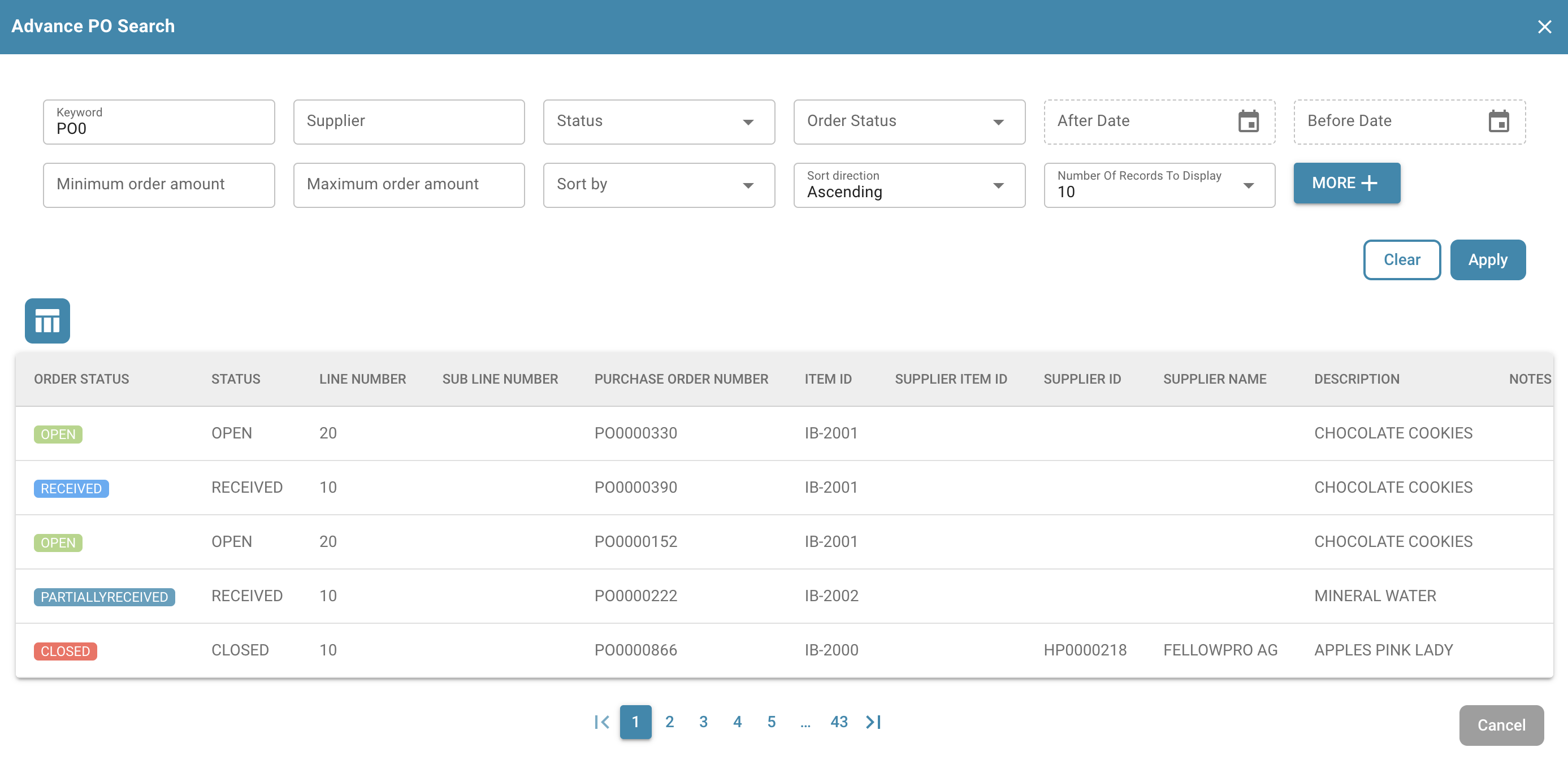 The matching purchase orders will be displayed based on the applied filters.\nYou can either: