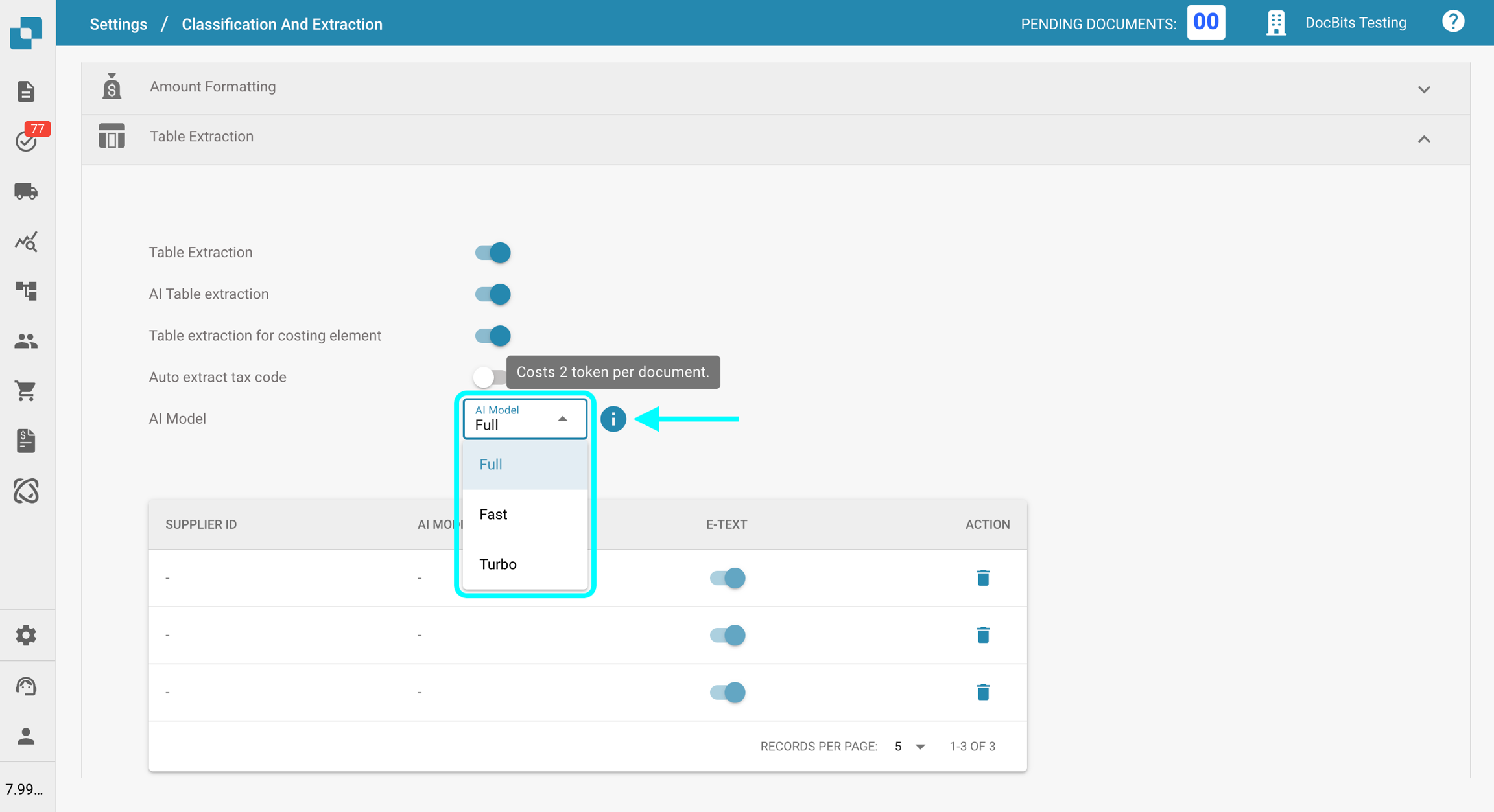 La configuración del Modelo de IA te permite definir qué modelo de IA se utiliza de forma predeterminada para la extracción de campo y la extracción de tabla durante el procesamiento de documentos. En esta sección, puedes revisar el costo de tokens para cada modelo y ver qué modelo está actualmente asignado a cada proveedor.