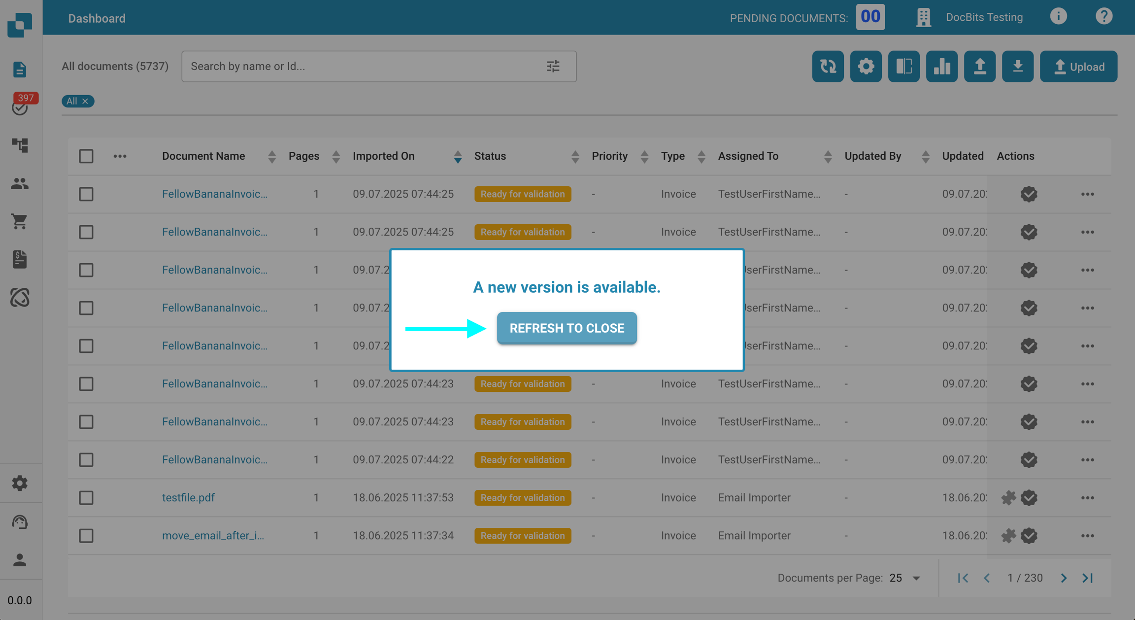 Haz clic en Actualizar para cerrar en la ventana del cuadro de diálogo. DocBits se recargará y se abrirá con la versión más reciente. Esto asegura que los usuarios siempre estén trabajando con las últimas características, mejoras y correcciones de errores.