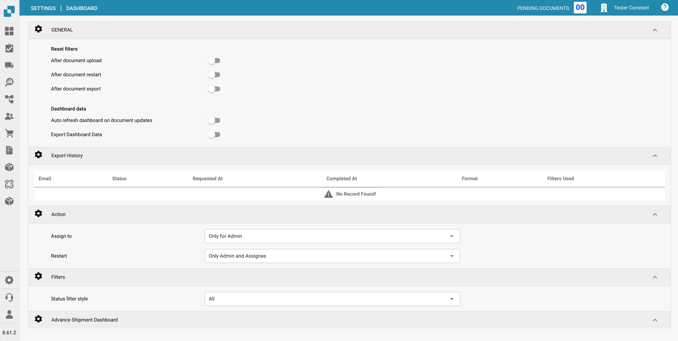 Restablecer filtros: Permite la configuración de cuándo deben restablecerse los filtros del panel, como después de la carga de documentos, reinicio de documentos o exportación de documentos. Esto ayuda a mantener un lienzo limpio para la visualización de datos según las etapas específicas del flujo de trabajo.