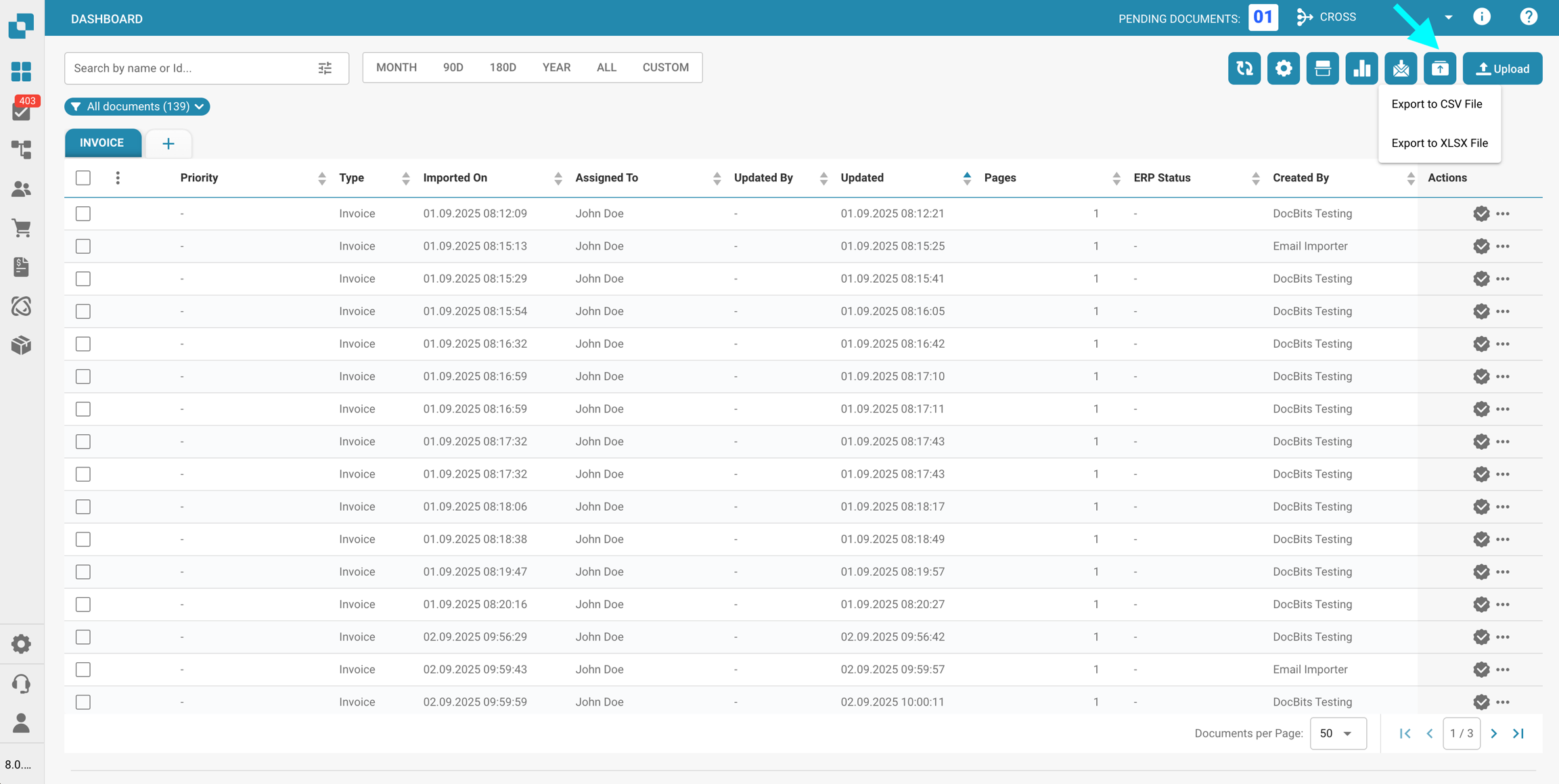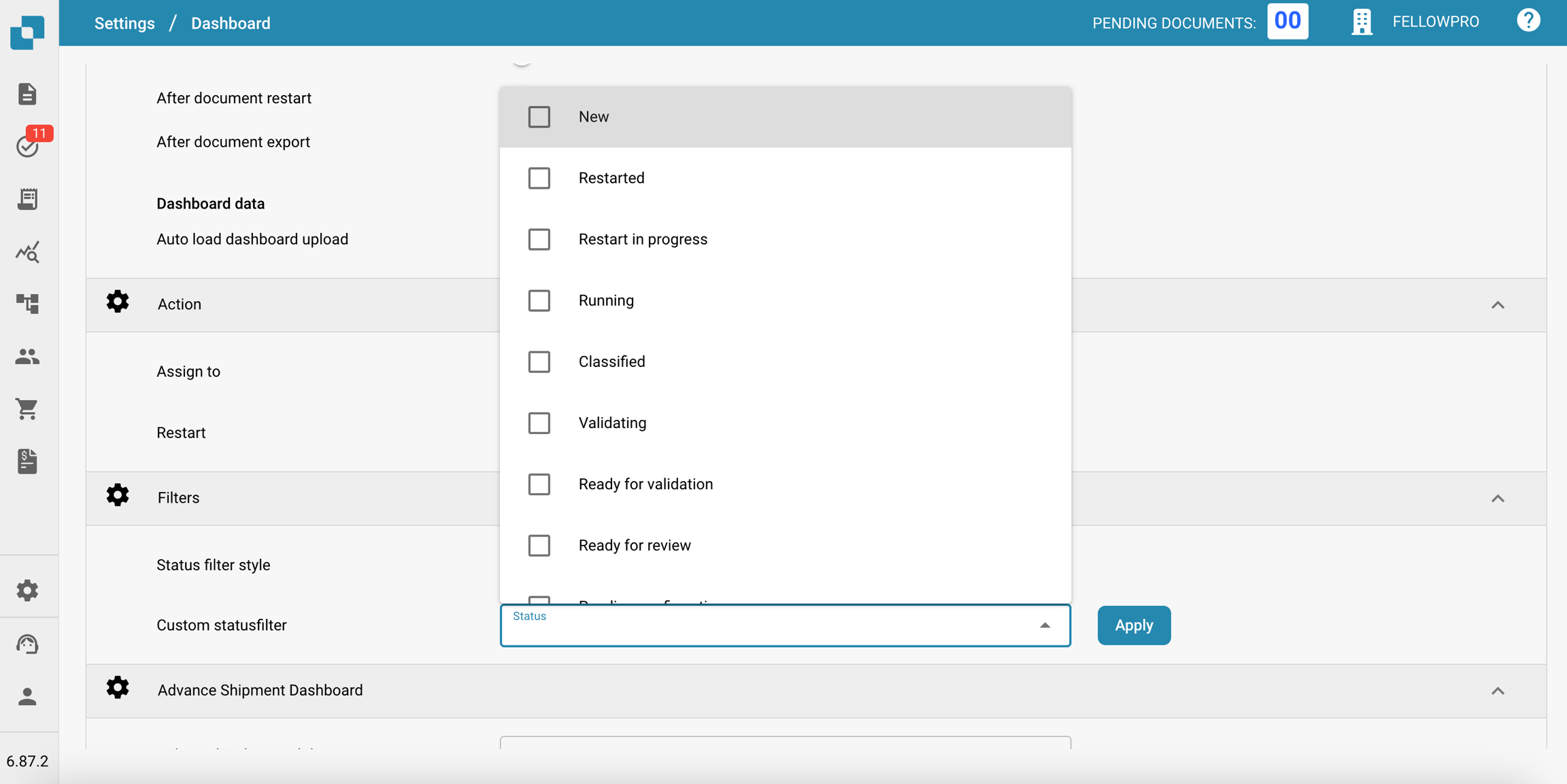 Filtro de estado personalizado: Permite la creación y aplicación de filtros personalizados que pueden dirigirse a estados de documentos específicos como "Nuevo", "Validando" o "Exportando". Esto permite a los usuarios acceder rápidamente a documentos en etapas específicas de procesamiento.