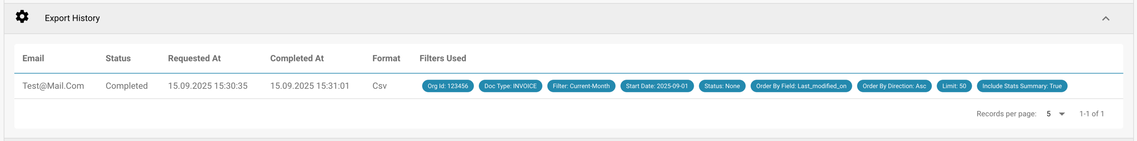 En el Historial de exportaciones, verás una tabla que lista todas las exportaciones pasadas junto con información clave sobre cada solicitud.