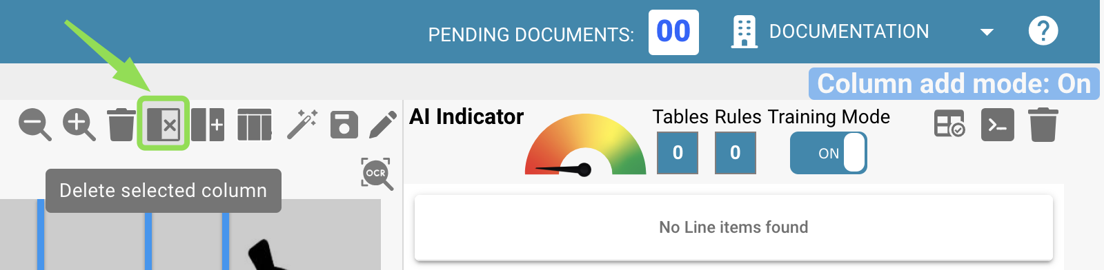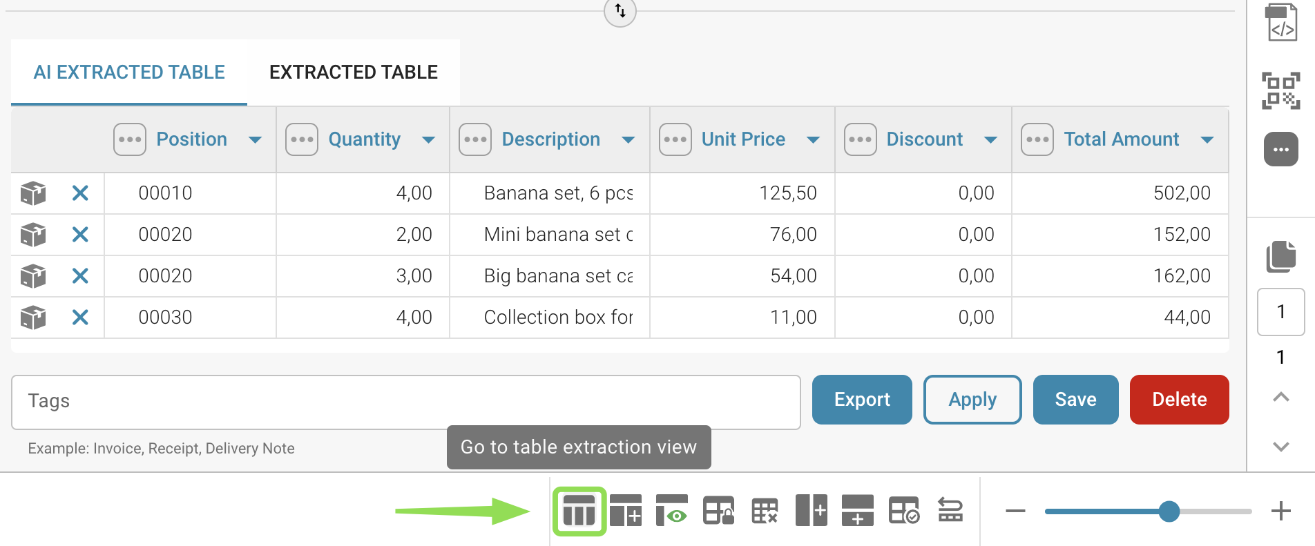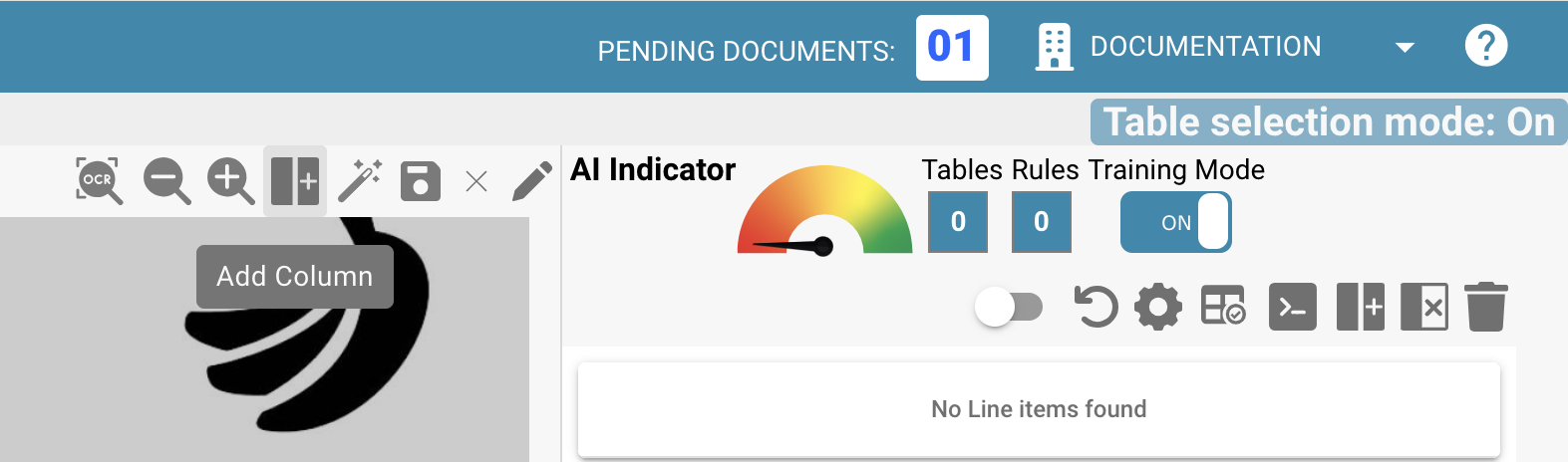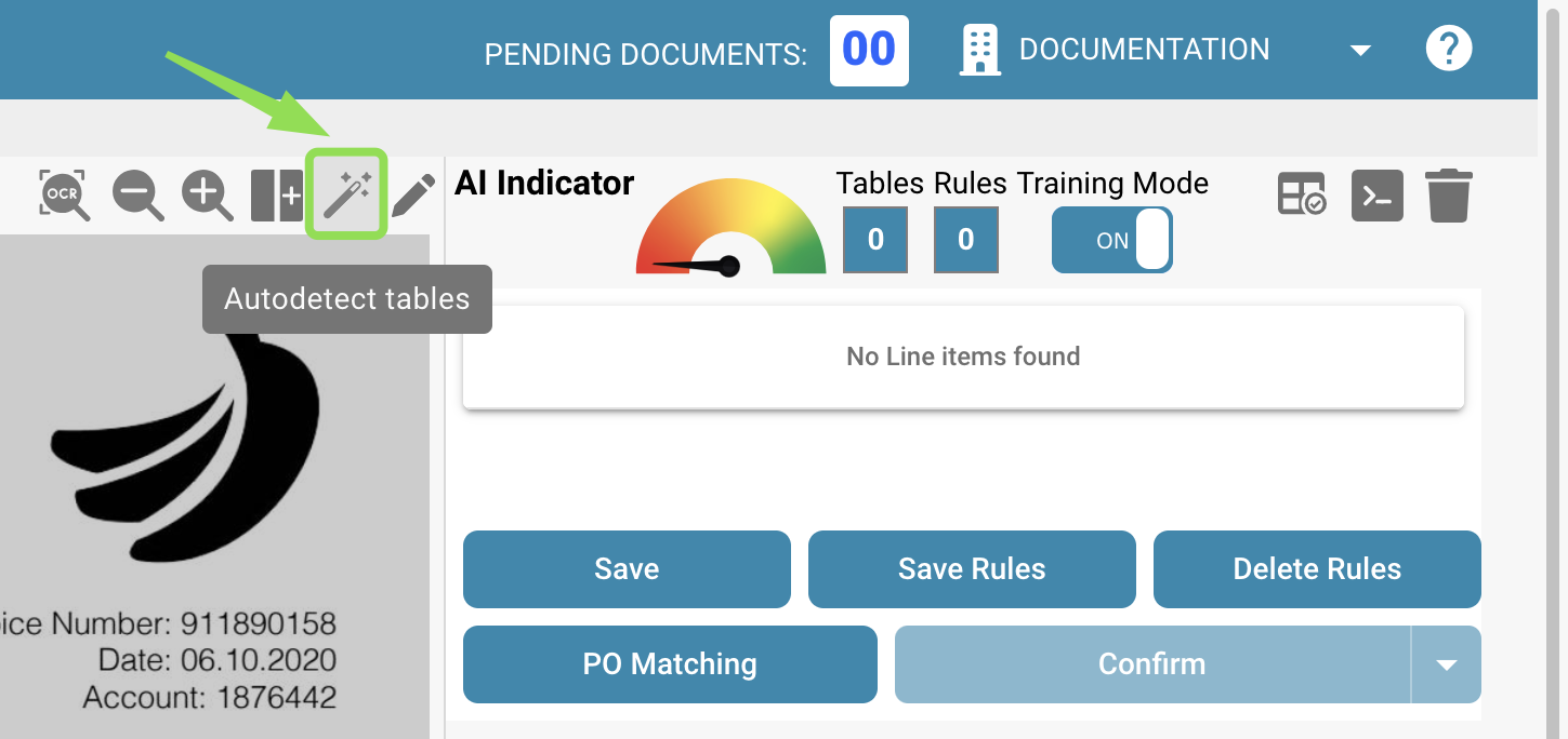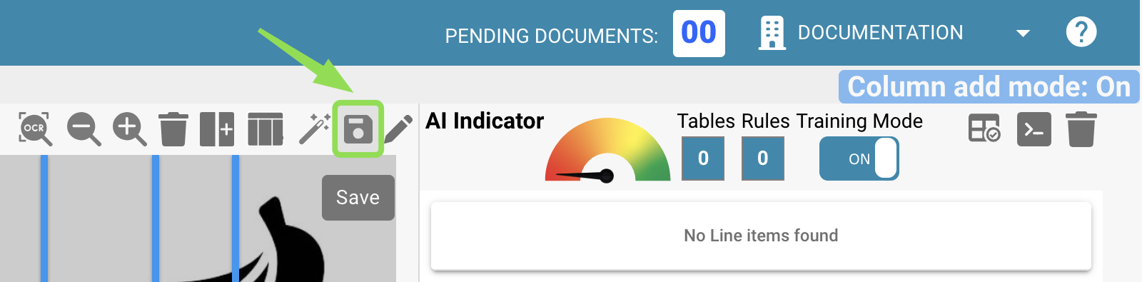 Para definir tablas y columnas en un documento, por favor importe un documento, ábralo y vaya a la vista de extracción de tablas como ya se conoce (a través de "Ítems de línea").
