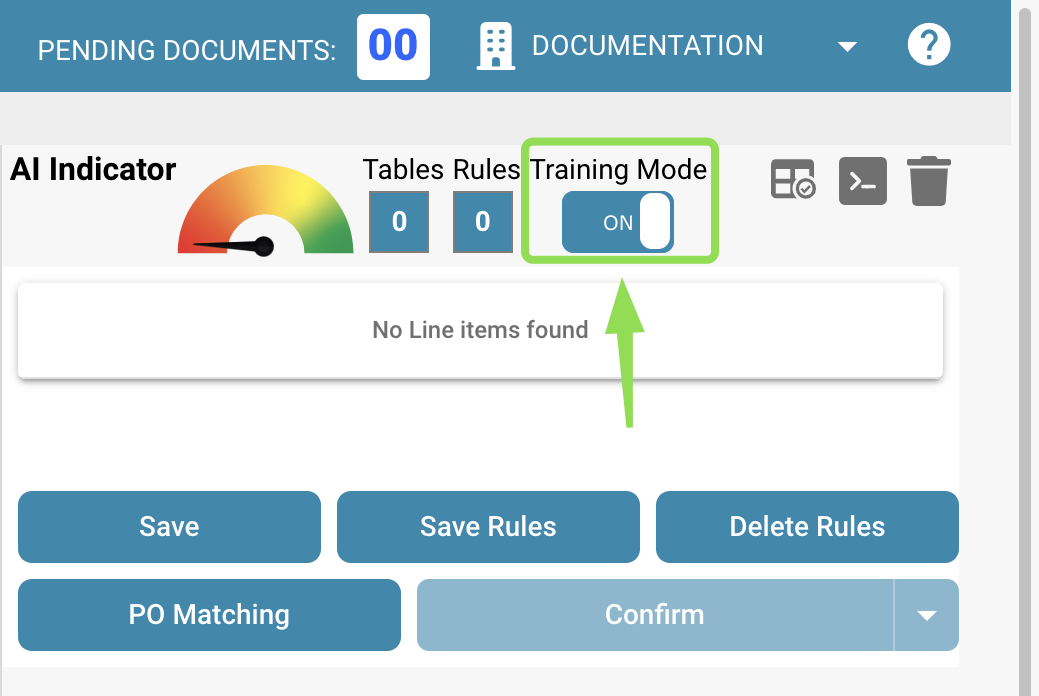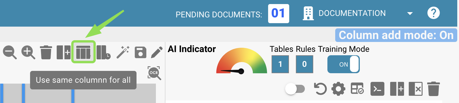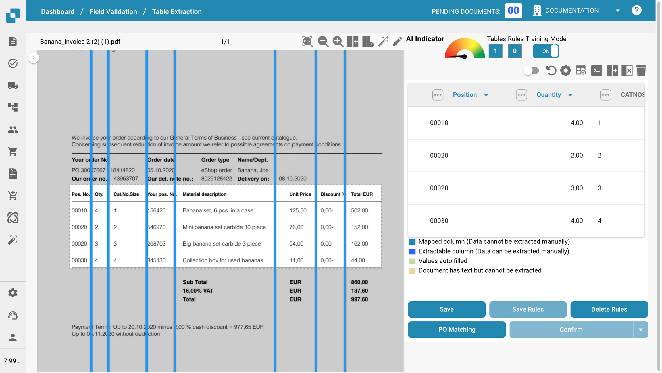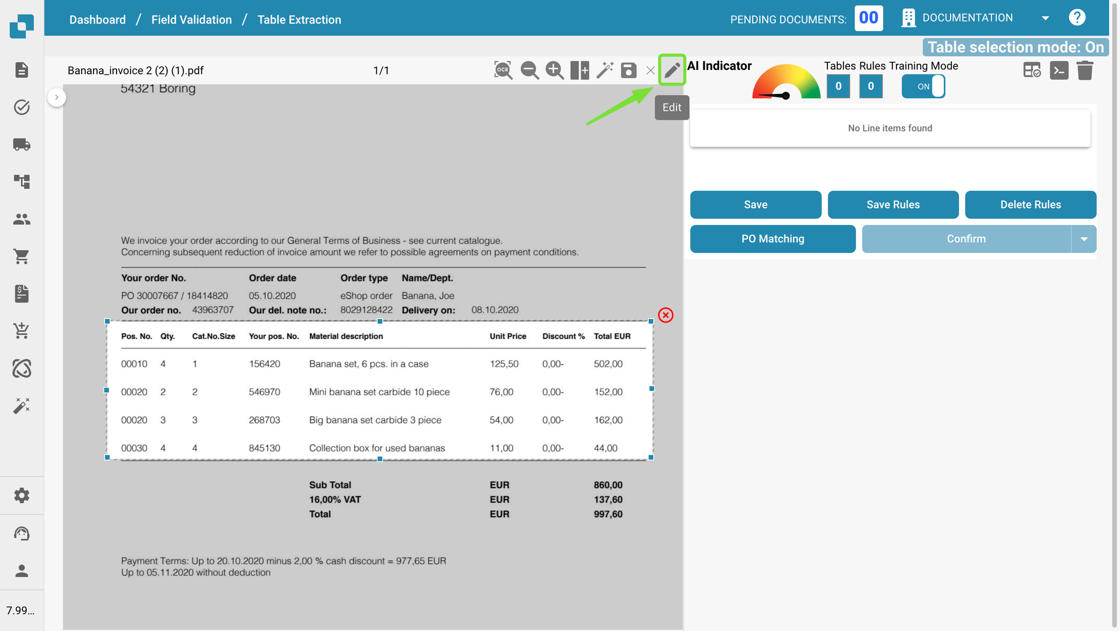 Para definir tablas y columnas en un documento, por favor importe un documento, ábralo y vaya a la vista de extracción de tablas como ya se conoce (a través de "Ítems de línea").