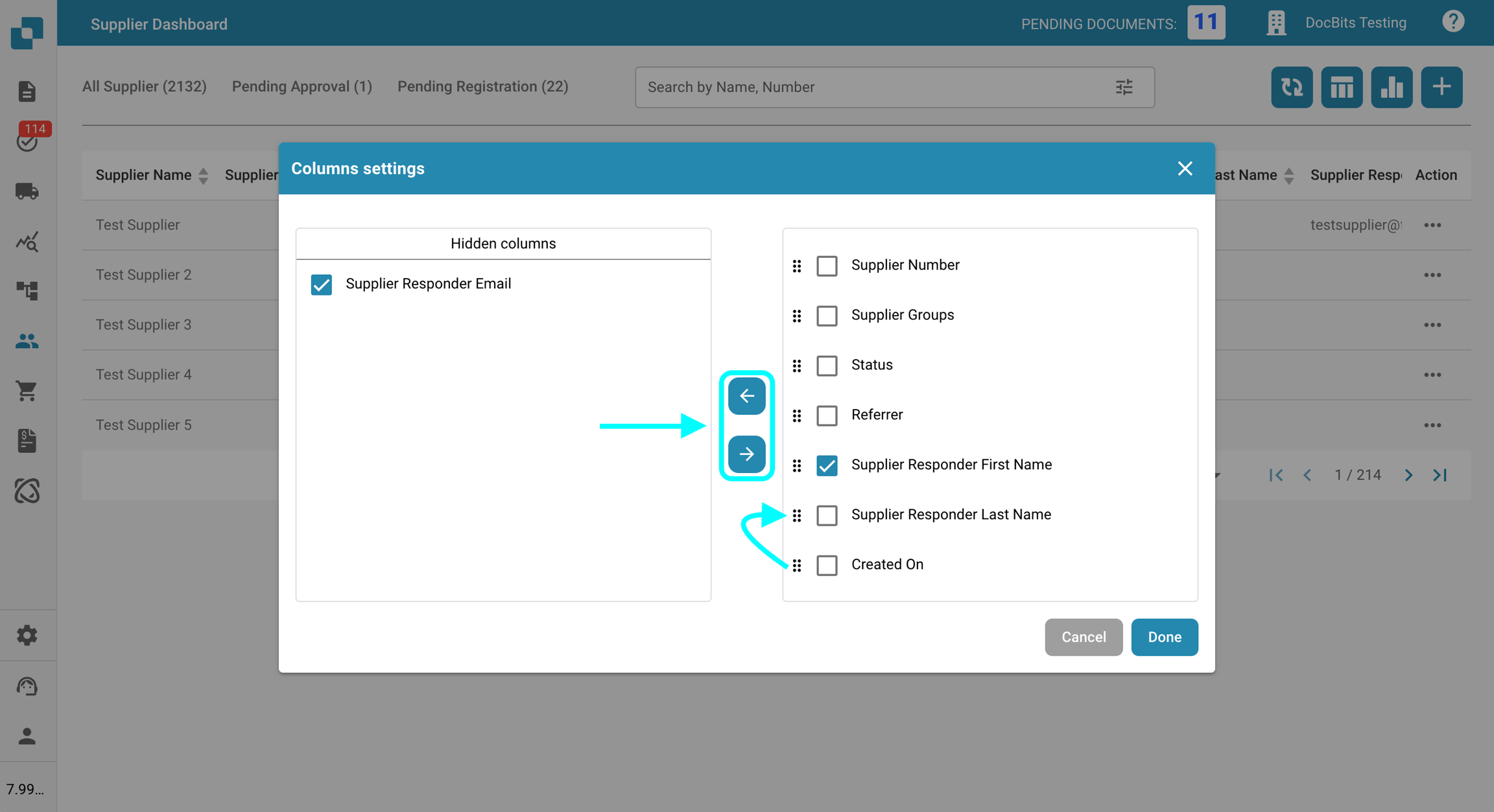 Haz clic en este botón para abrir un menú donde puedes gestionar la visibilidad de las columnas en la tabla de órdenes de compra. Usa las casillas de verificación y los botones de flecha para mover columnas entre las secciones visibles y ocultas. También puedes reordenar columnas arrastrando y soltando los nombres de las columnas. Haz clic en Hecho para guardar tus cambios.