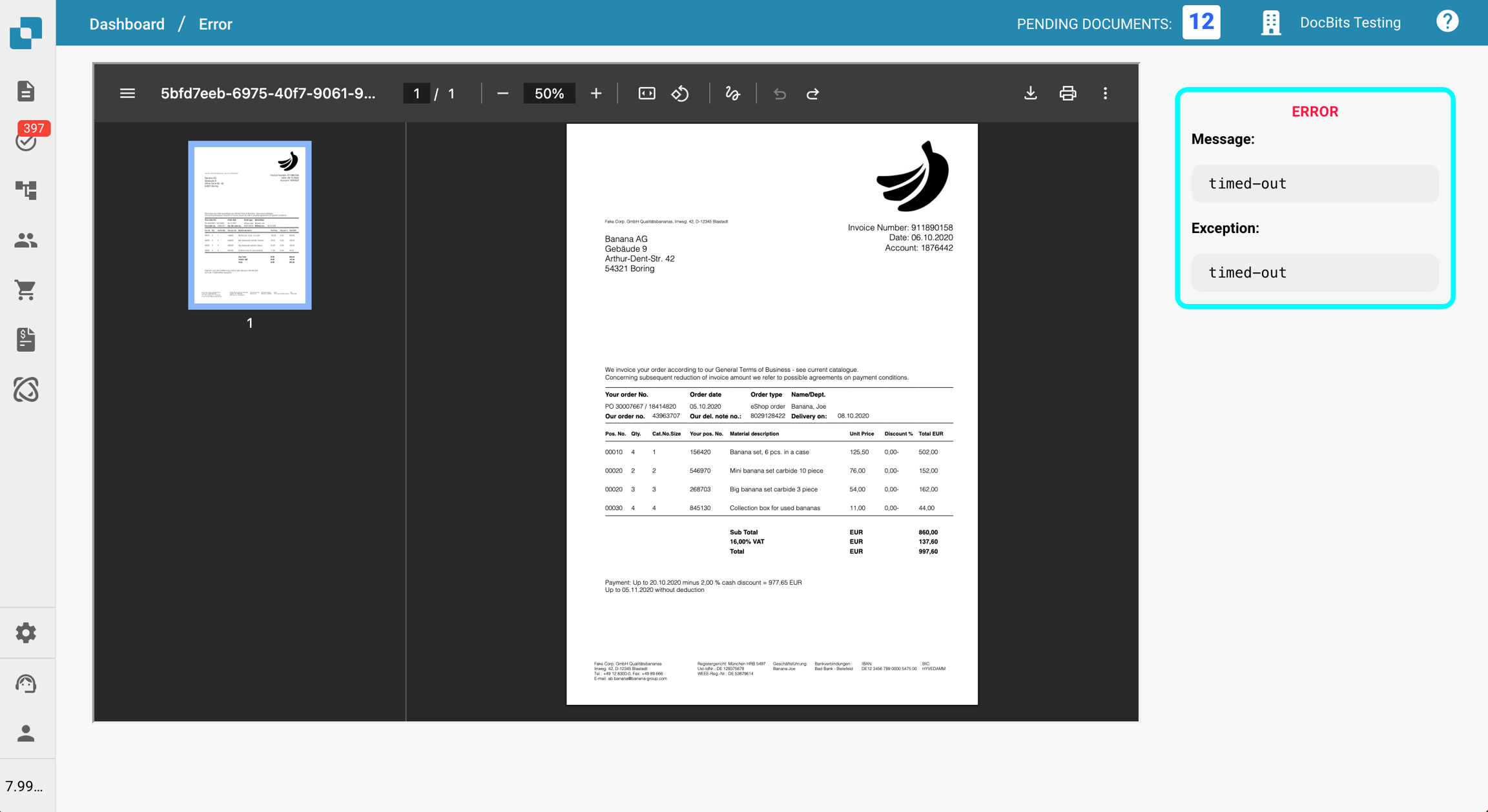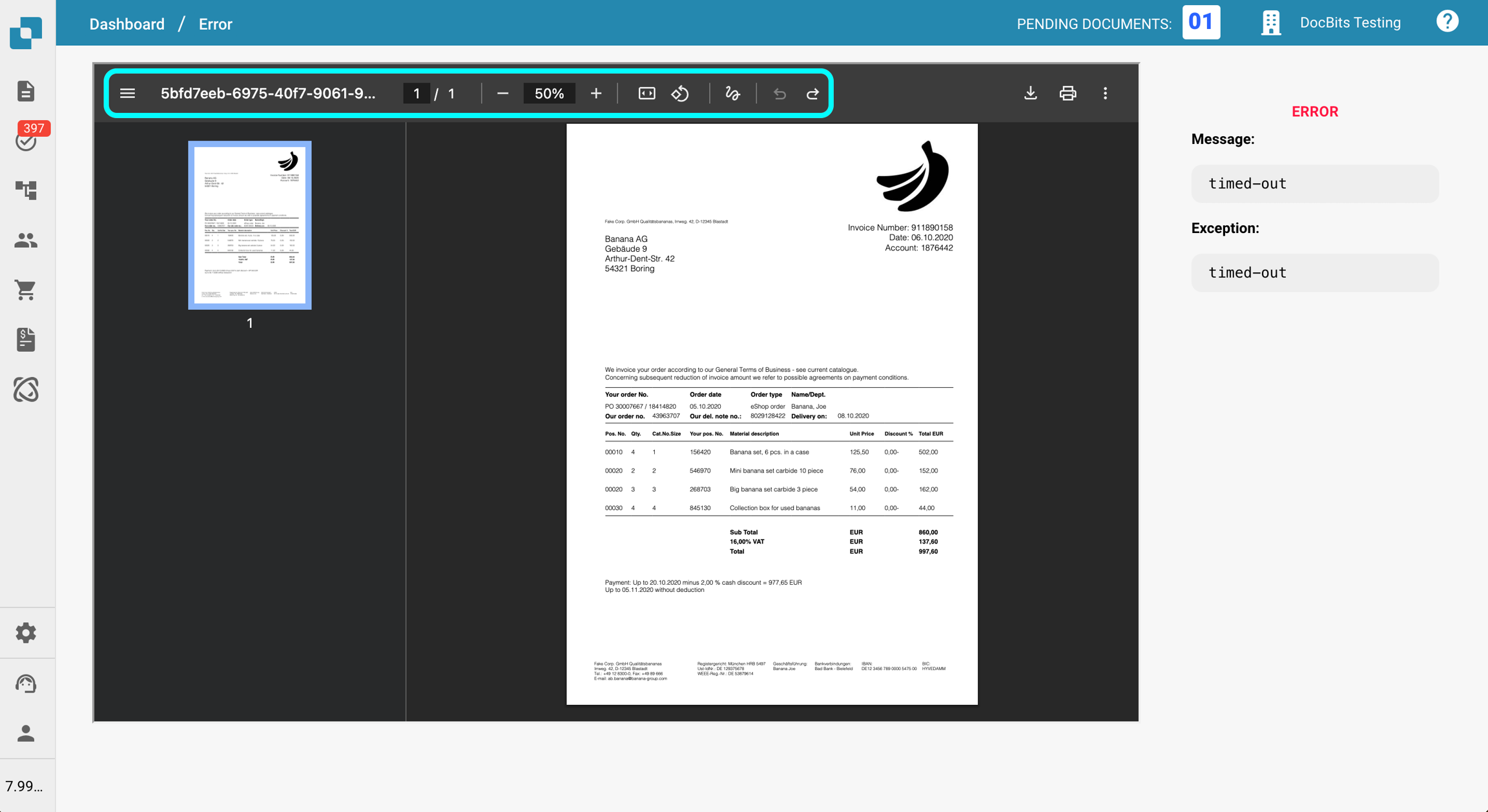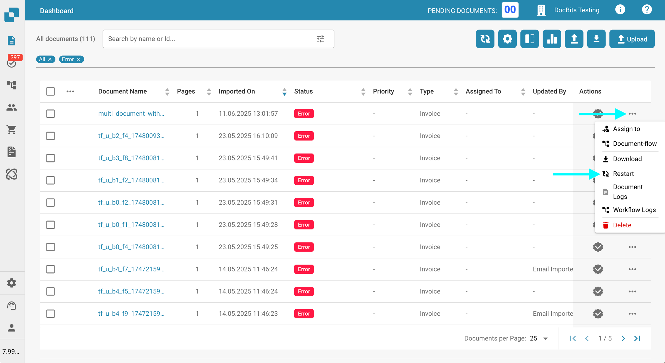 Si ocurre un error durante el flujo de trabajo de su documento, el documento entrará en el estado "Error". Cuando esto suceda, puede hacer clic en el documento para: