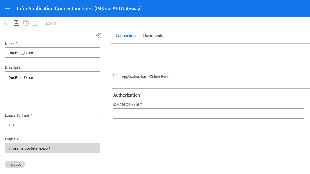 ION Mapping File: Puede encontrarlo en Infor OS → API Gateway → Authorized Apps. Busque la aplicación DocBits, ábrala y descargue las credenciales.