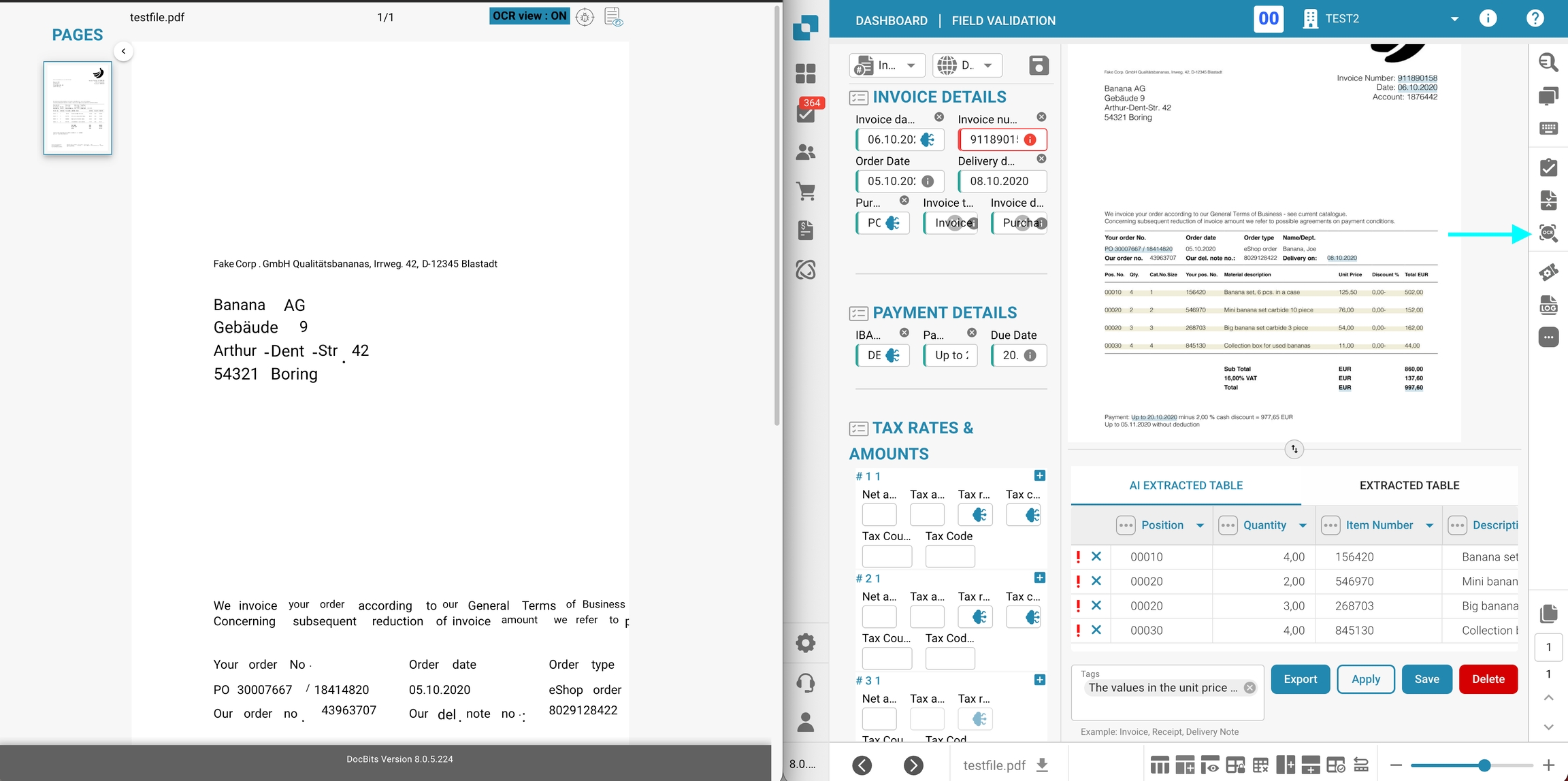 Agregar acceso de usuario a resultados de extracción OCR: El botón Vista OCR en la pantalla de validación de campos ahora está disponible para todos los usuarios que tienen acceso de validación, en lugar de estar limitado a los administradores. Con esta actualización, cualquier usuario autorizado puede revisar los resultados de extracción OCR directamente, facilitando la validación de la precisión de los datos y monitoreando el rendimiento general del OCR. Esta mejora promueve una mayor transparencia y mejora la eficiencia del flujo de trabajo de validación.